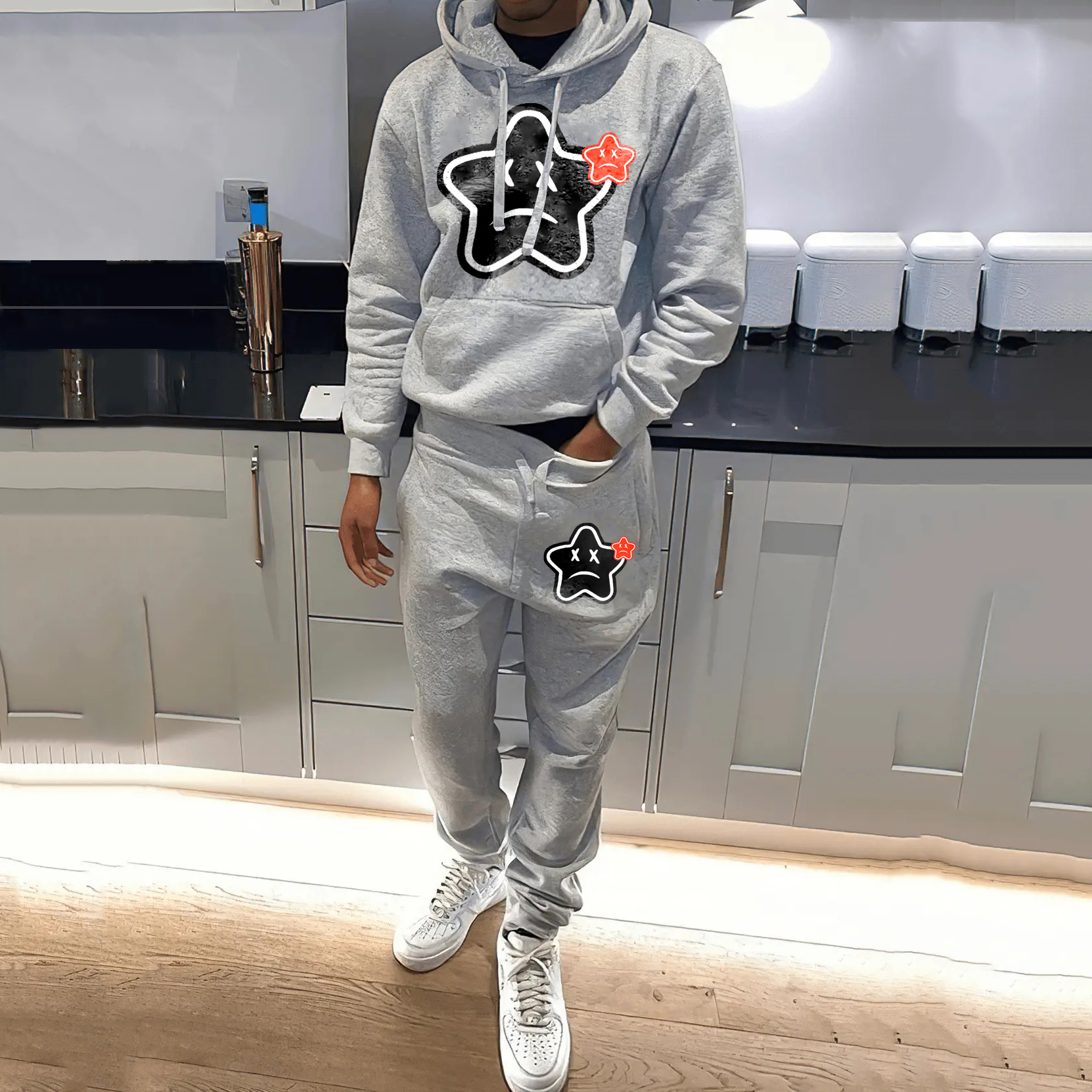 Pentagram Expression Print Hoodie Sweatpants Two Piece Set