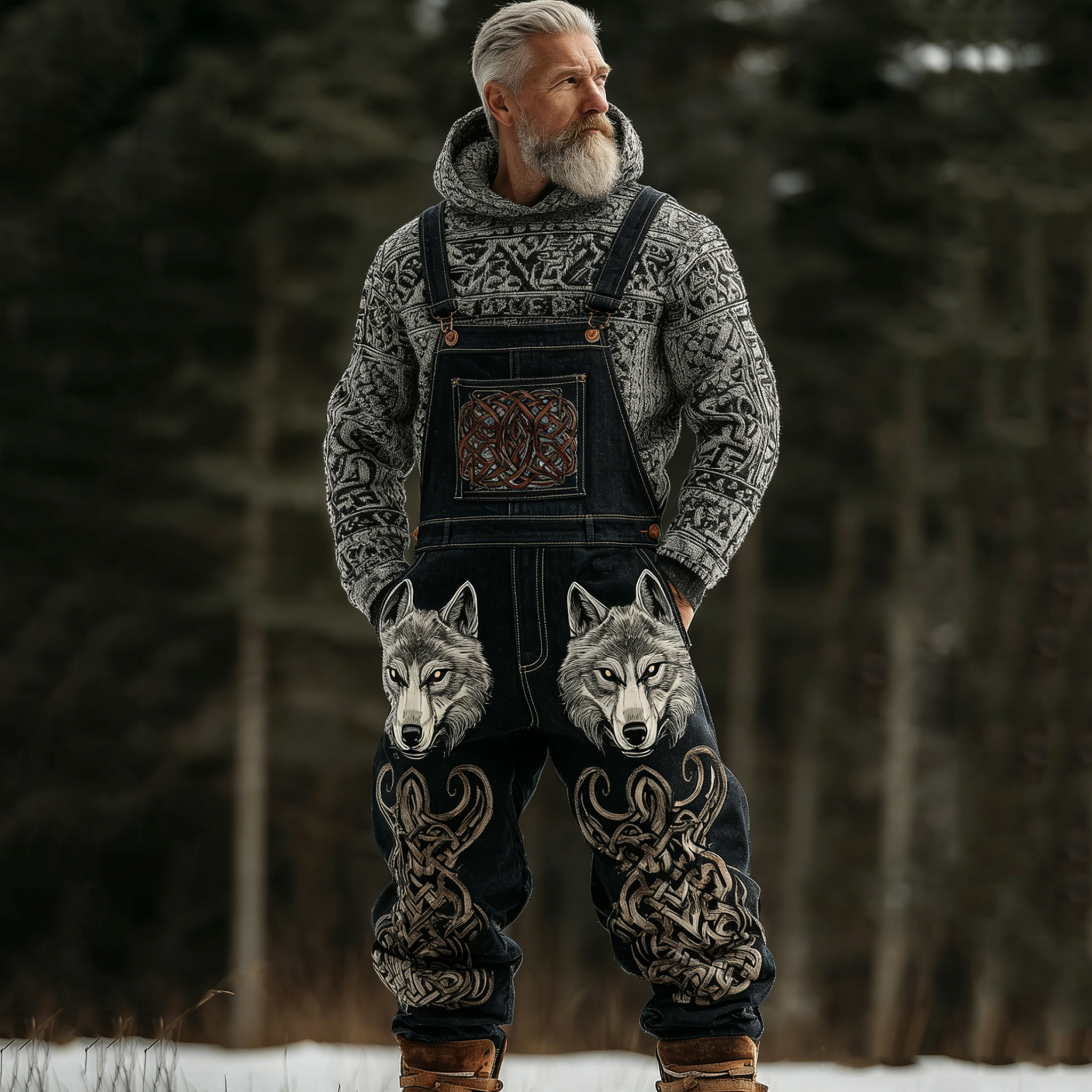 Men's Viking Celtic Knot And Wolf Head Faux Denim Jumpsuit
