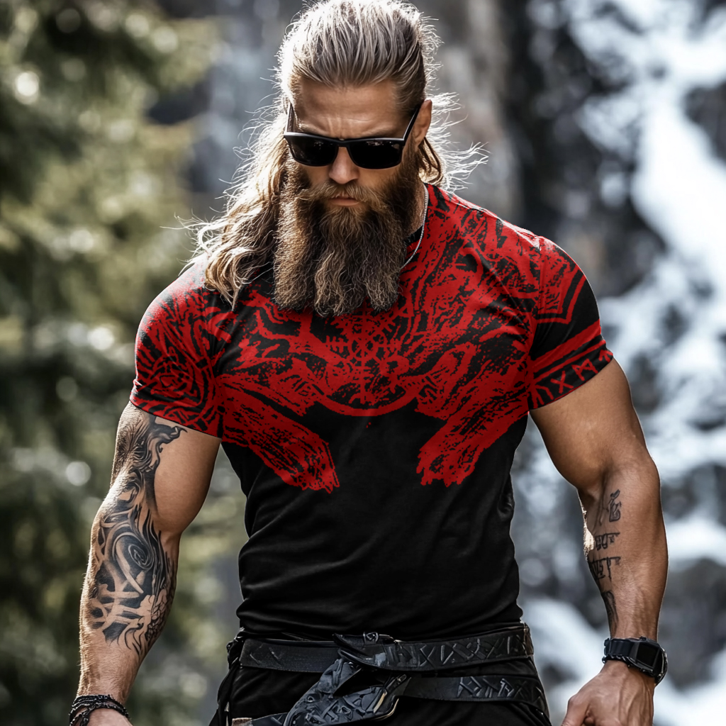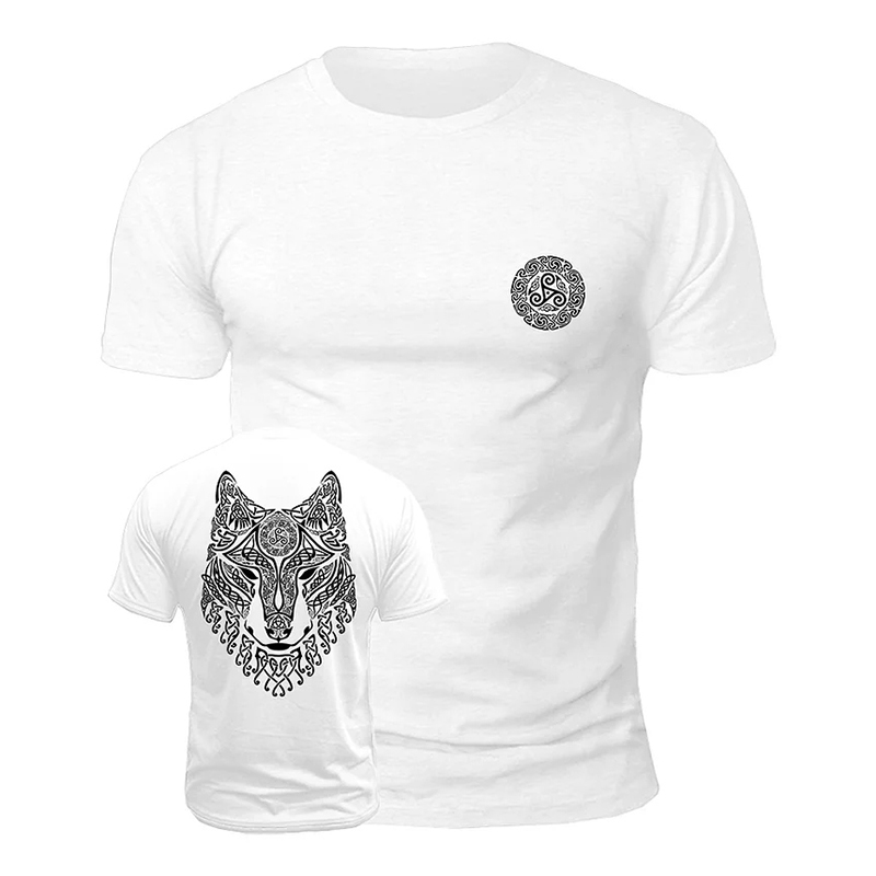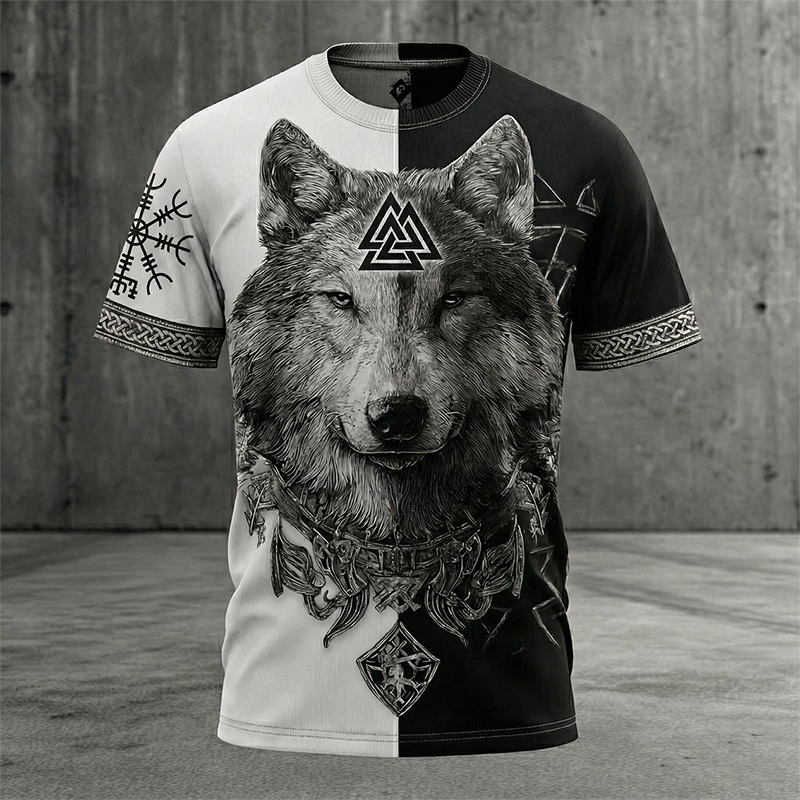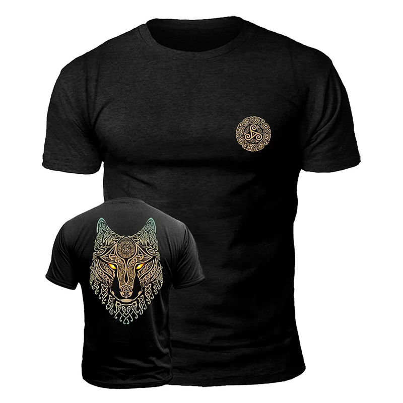 Men's Retro Viking Wolf Rune Yingyang Print Short-sleeve T-shirt