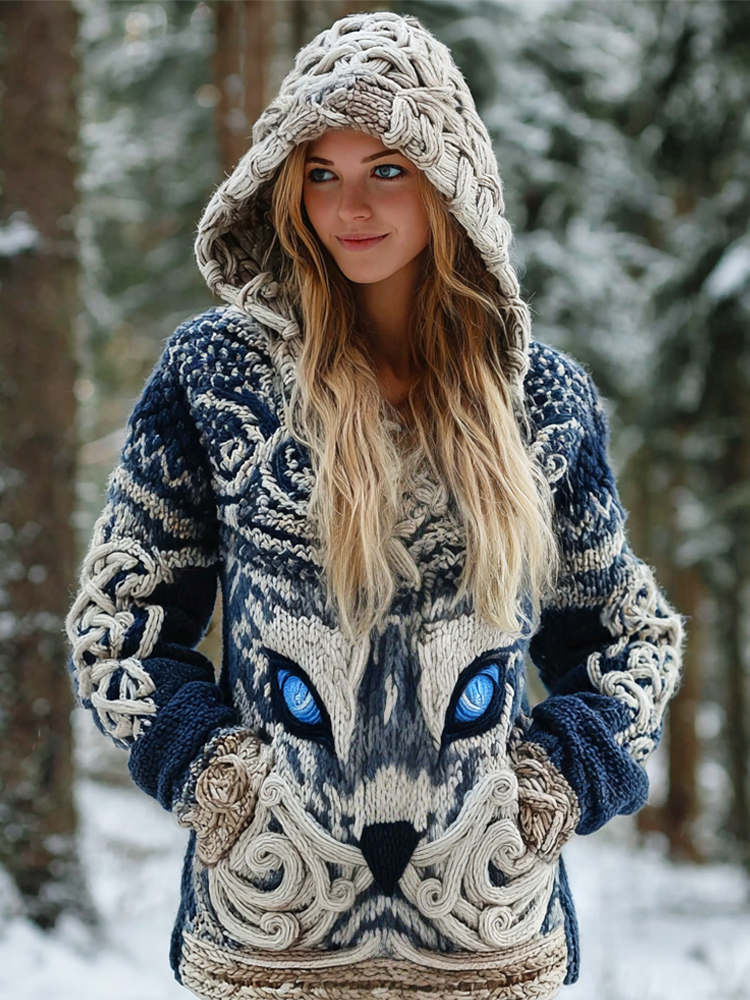 Women's Retro Viking Wolf Jacquard Hooded Knit Sweater Jacket