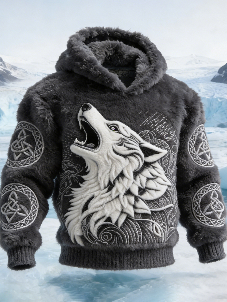 Men's Retro Celtic Knot And Wolf Pattern Flannel Hooded Sweatshirt