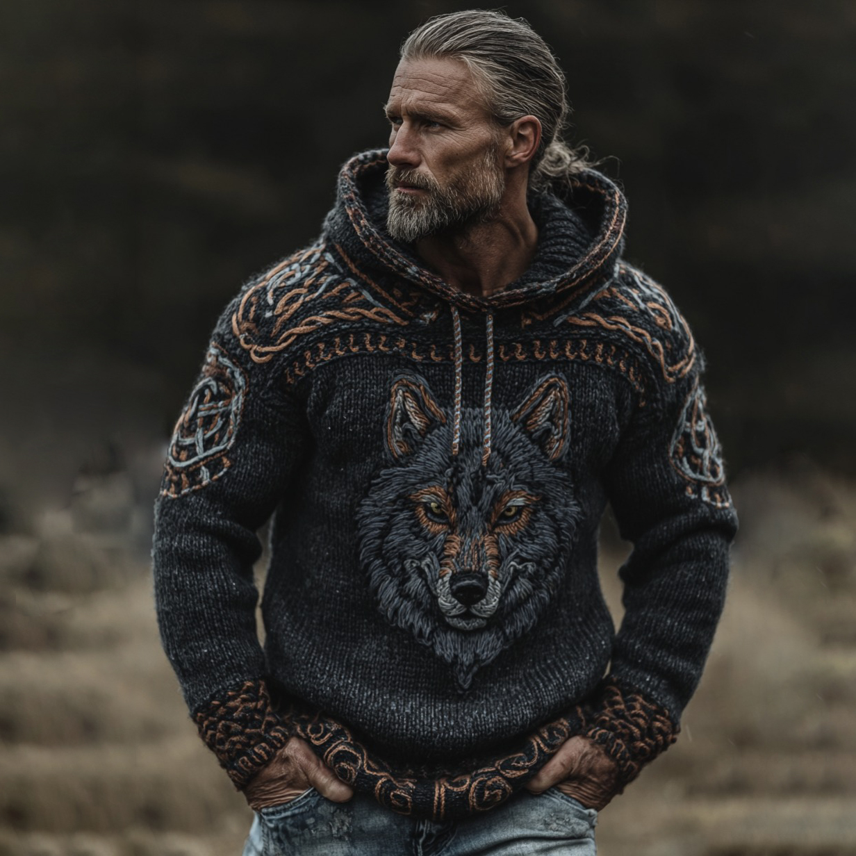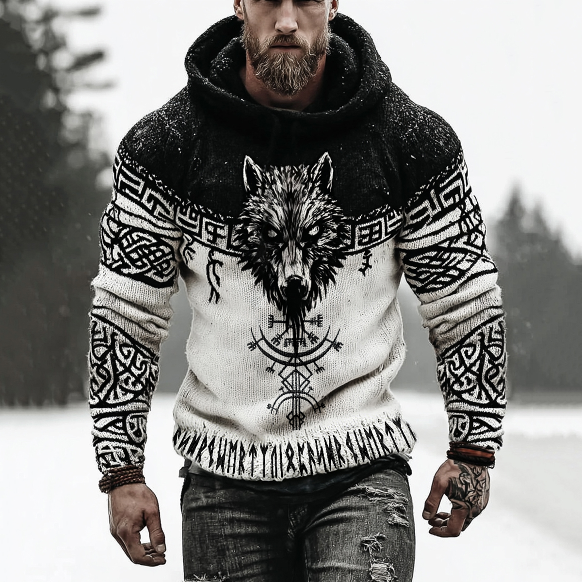 Men's Viking Tribal Wolf Jacquard Pattern Art Hooded Sweater