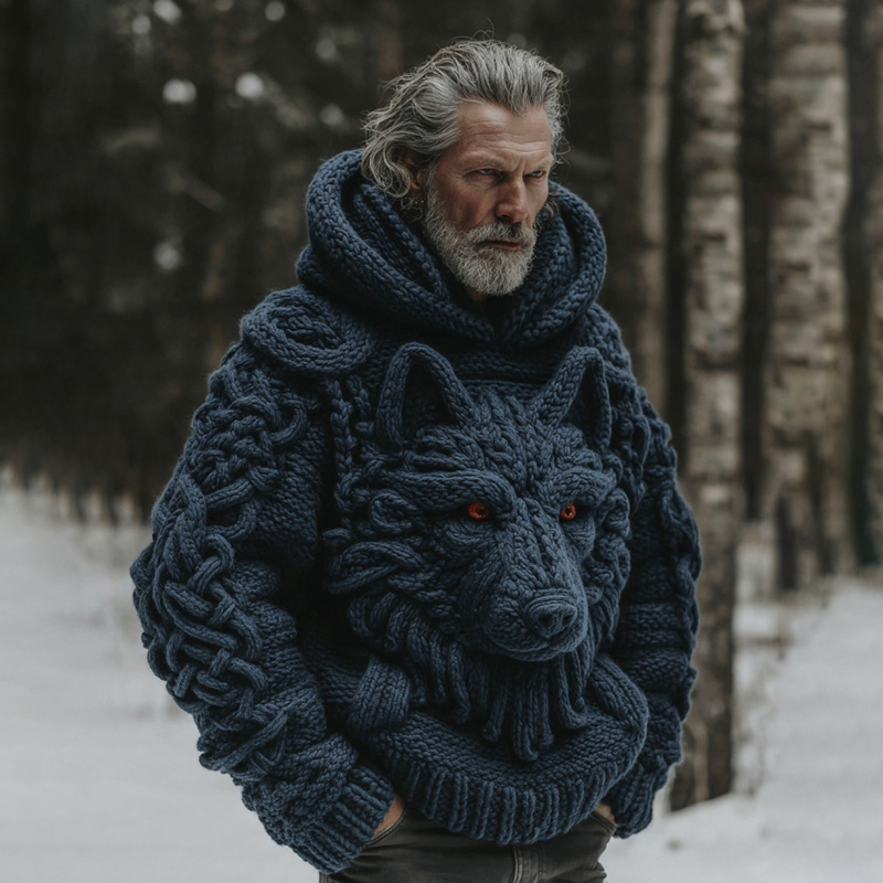 Men's Vintage Viking Wolf Celtic Knot Art Cozy Knit Hooded Sweater