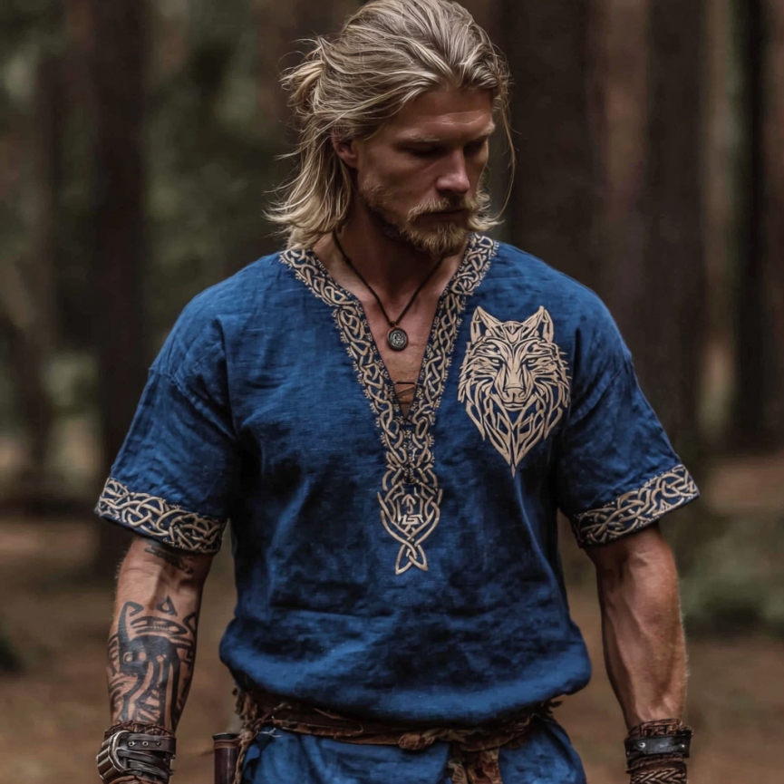 Men's Vintage Viking Wolf Art Linen Shirt
