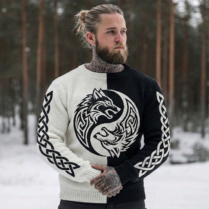 Men's Viking Tribal Wolf Jacquard Knitted Hooded Sweater