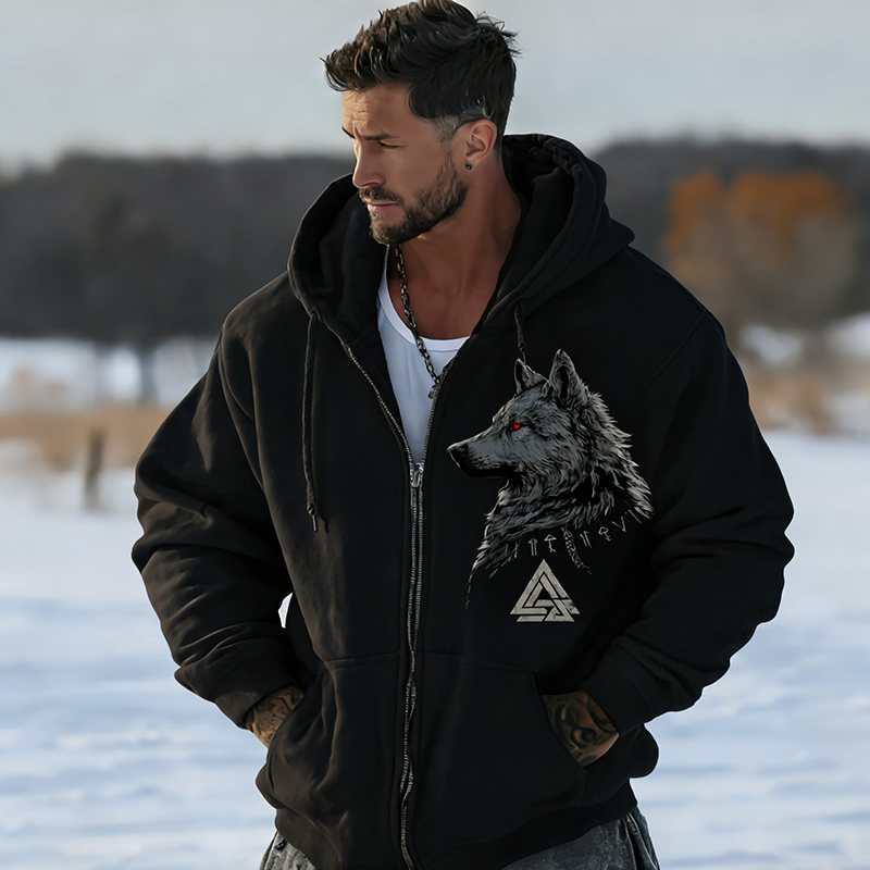 Men's Celtic Style Wolf Pattern Comfortable Hooded Cardigan Sweatshirt