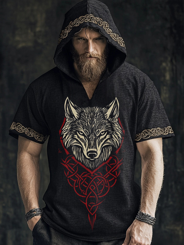 Men's Viking Celtic Wolf Embroidered Hooded Linen T Shirt