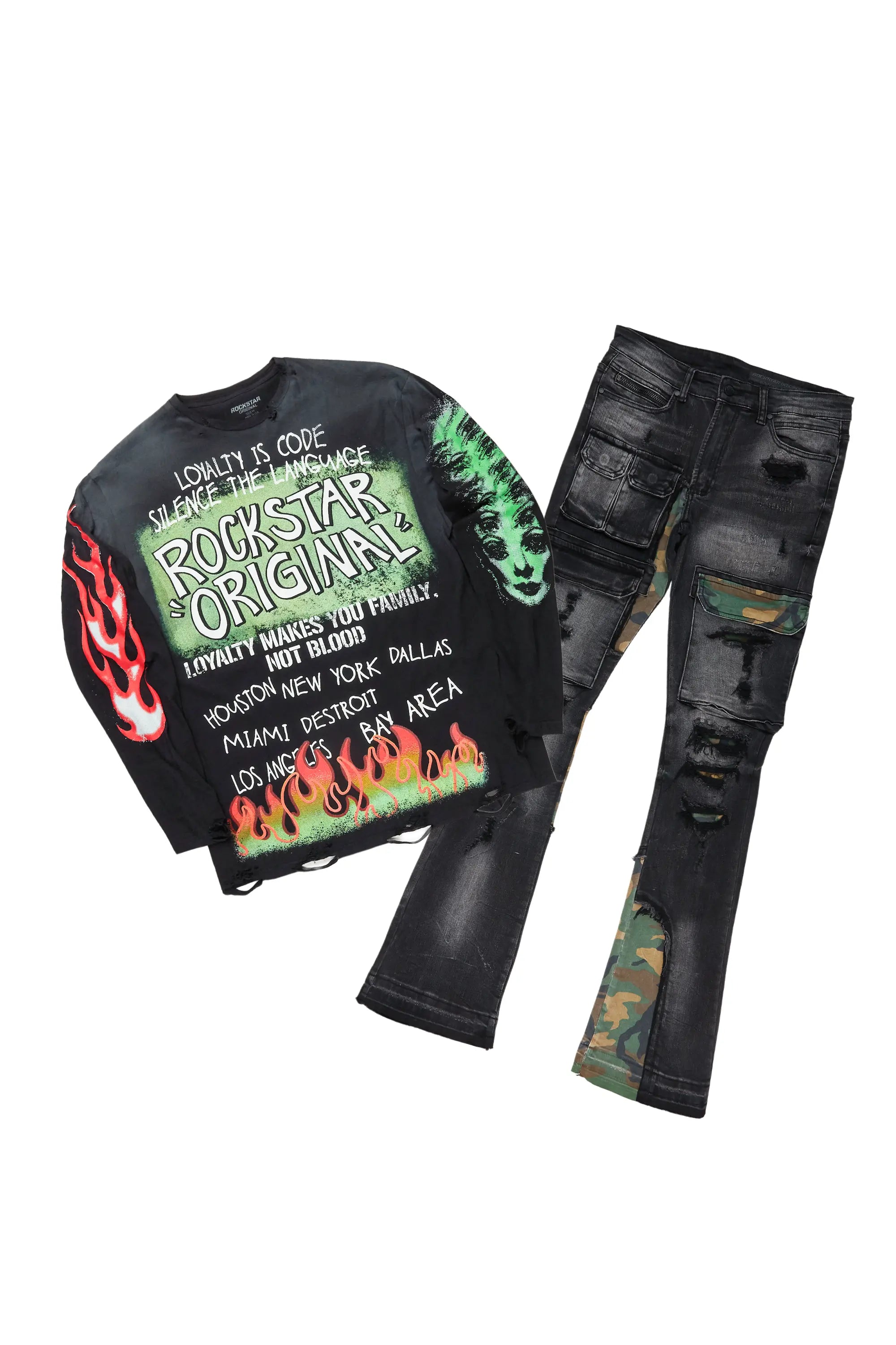 Beno Black/Black Long Sleeve T-Shirt & Zeta Super Stacked Flare Jean Bundle