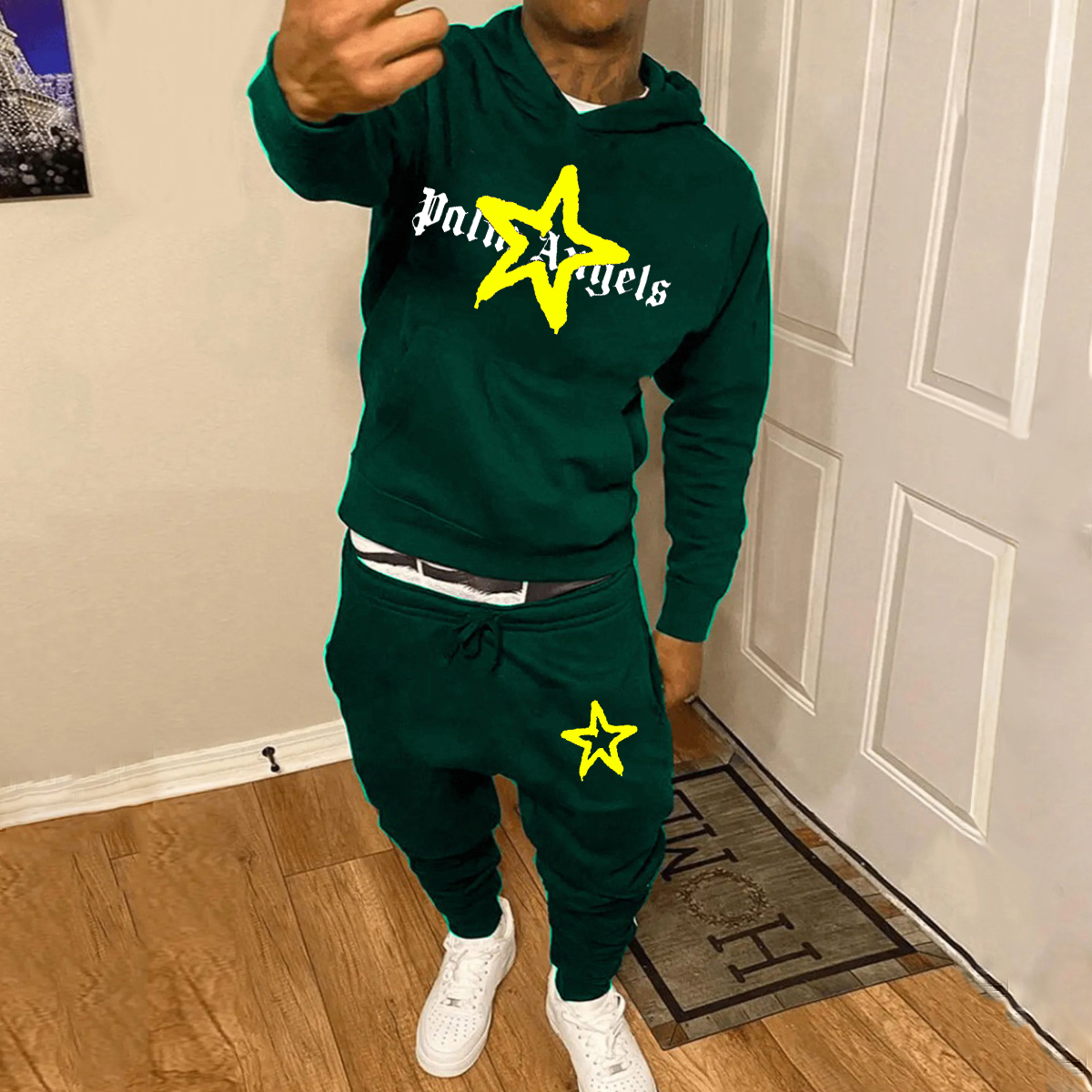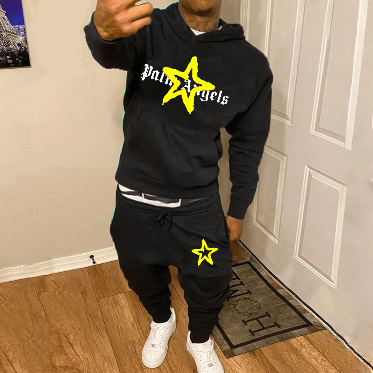 Casual street patchwork hoodie and trousers two-piece suit