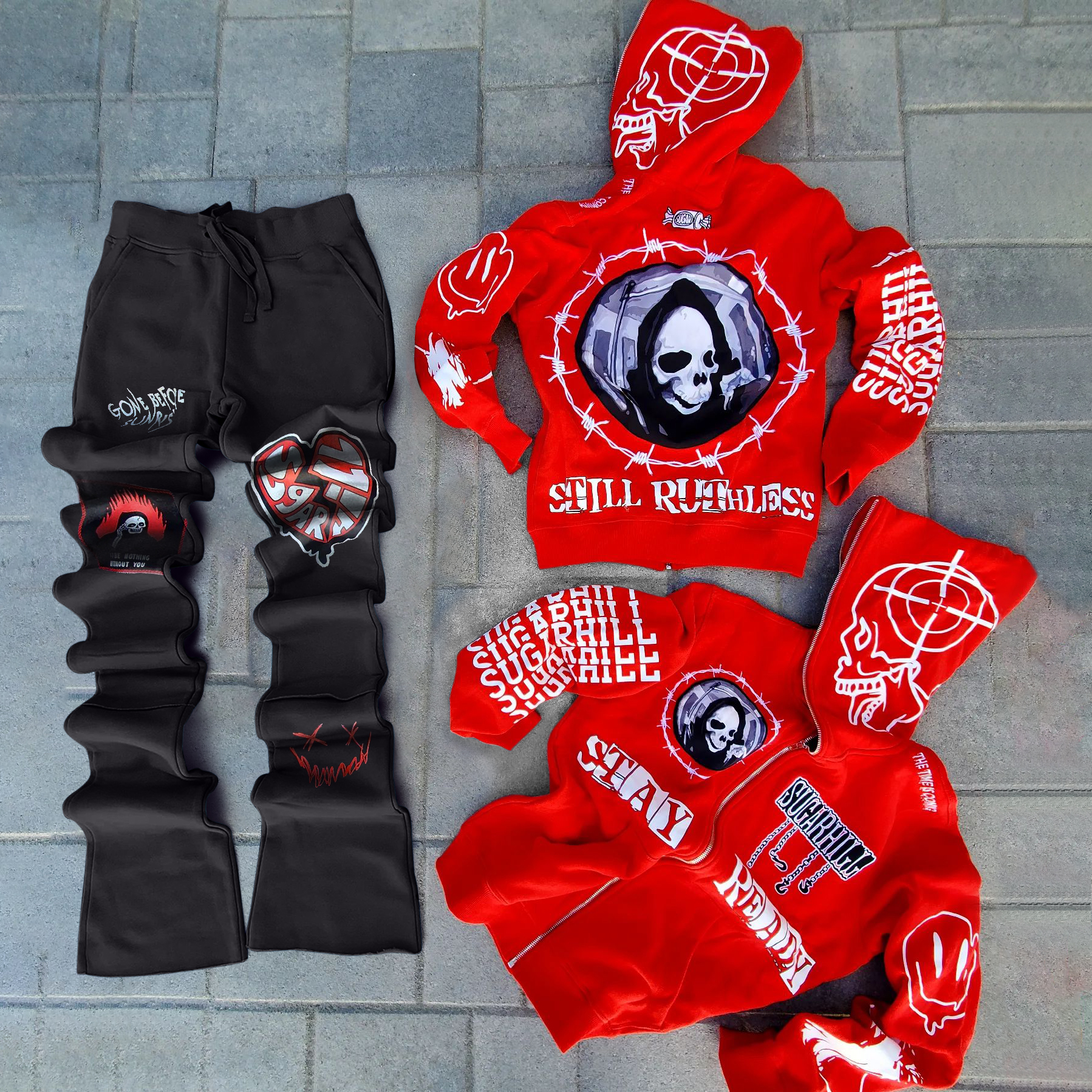Casual Retro Skull Full Zip Hoodie Set