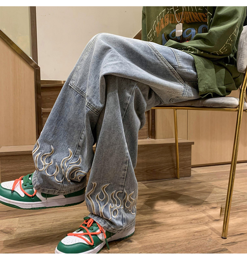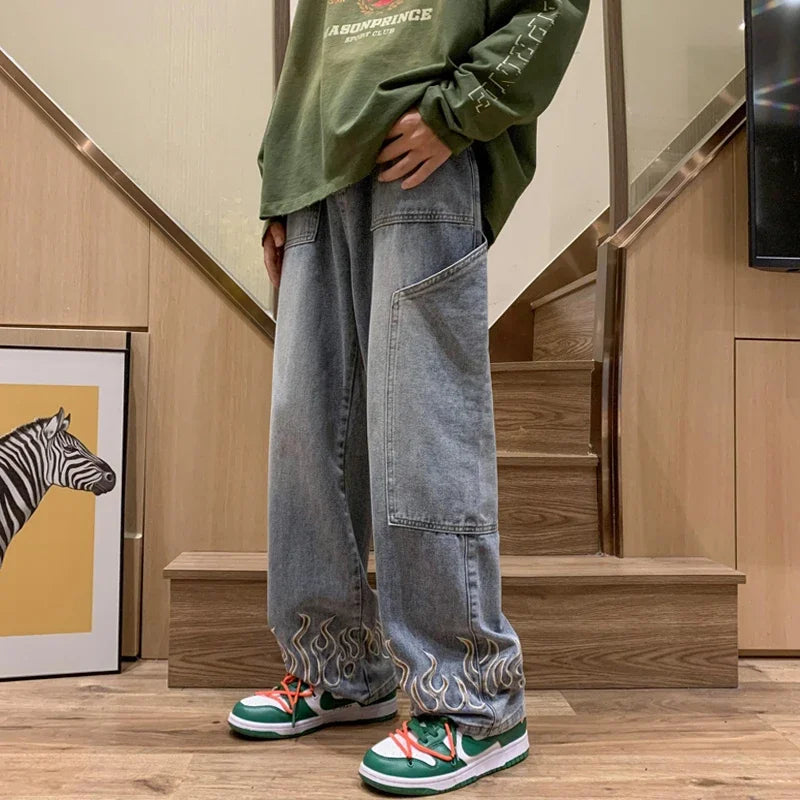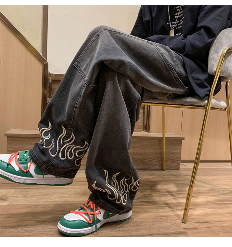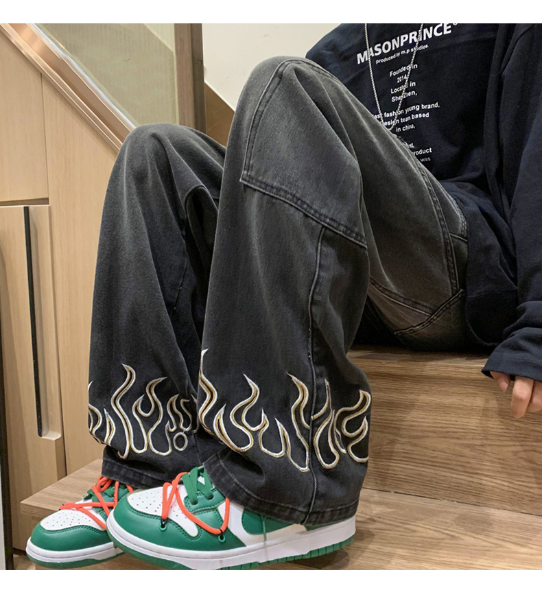 American Street Jeans Men Y2K Fall Design Feel Flame Embroidery Straight Casual Pants Fashion Brand Loose Wide Leg Pants Denim
