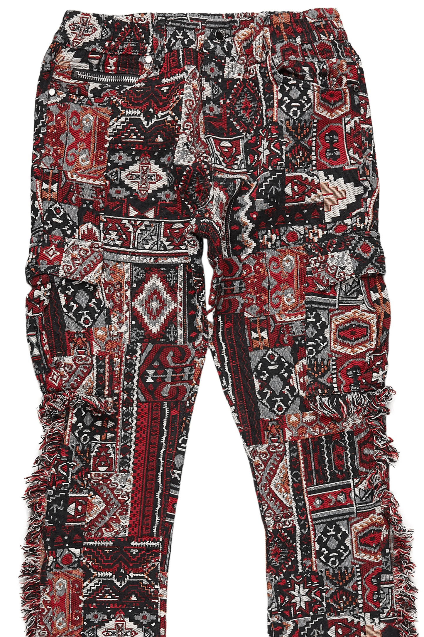 An urban cargo jean for men in black. Designed with organic cotton and custom hand-woven tapestry details for a dope denim streetwear style.