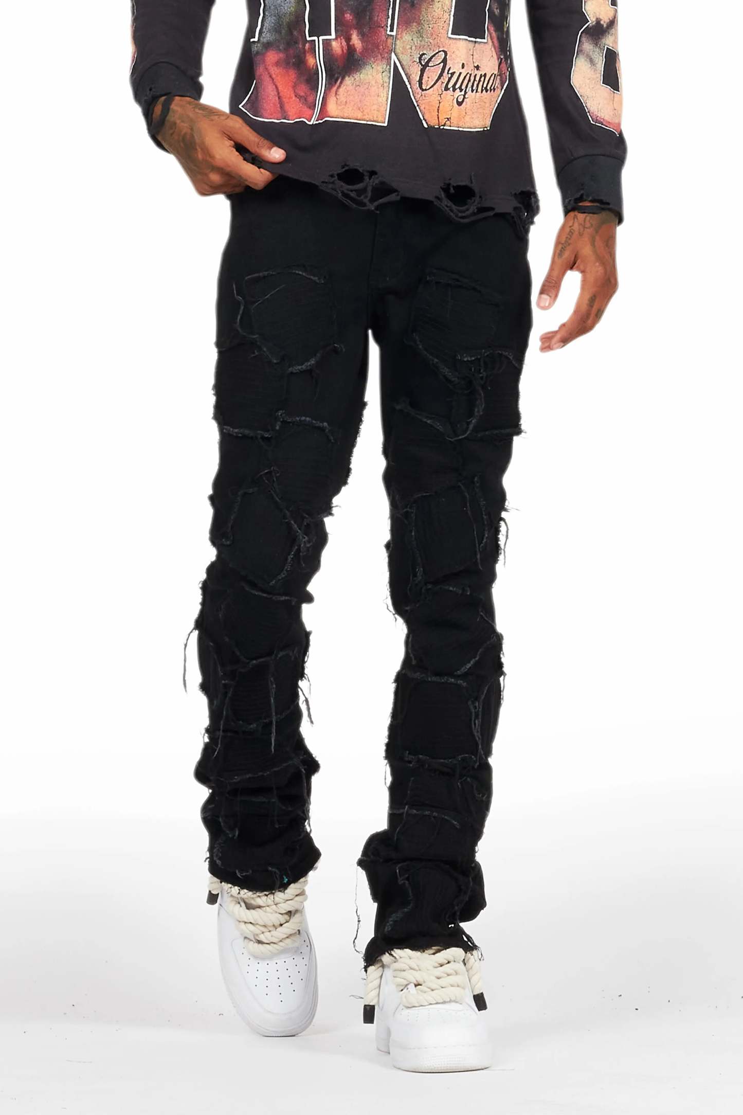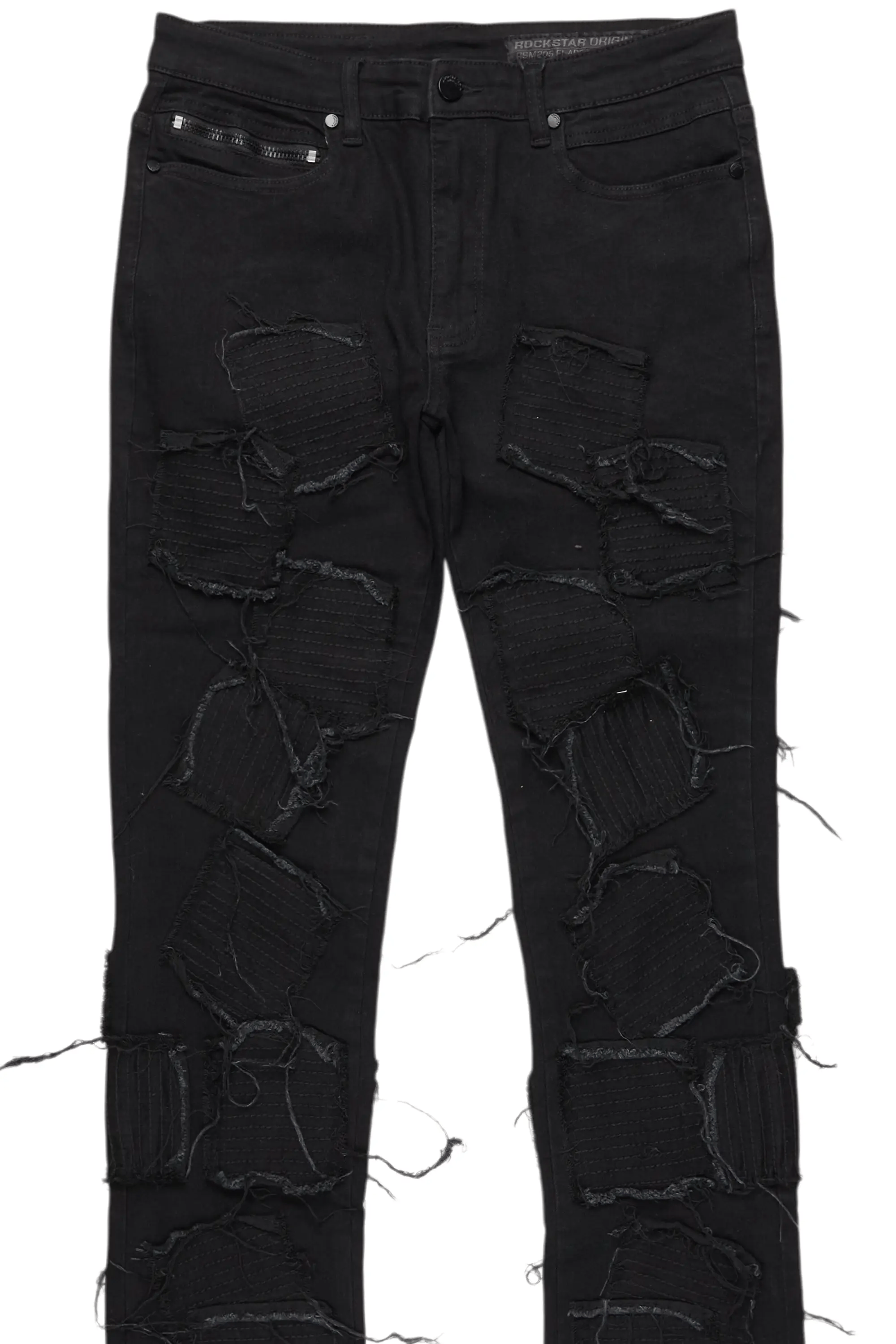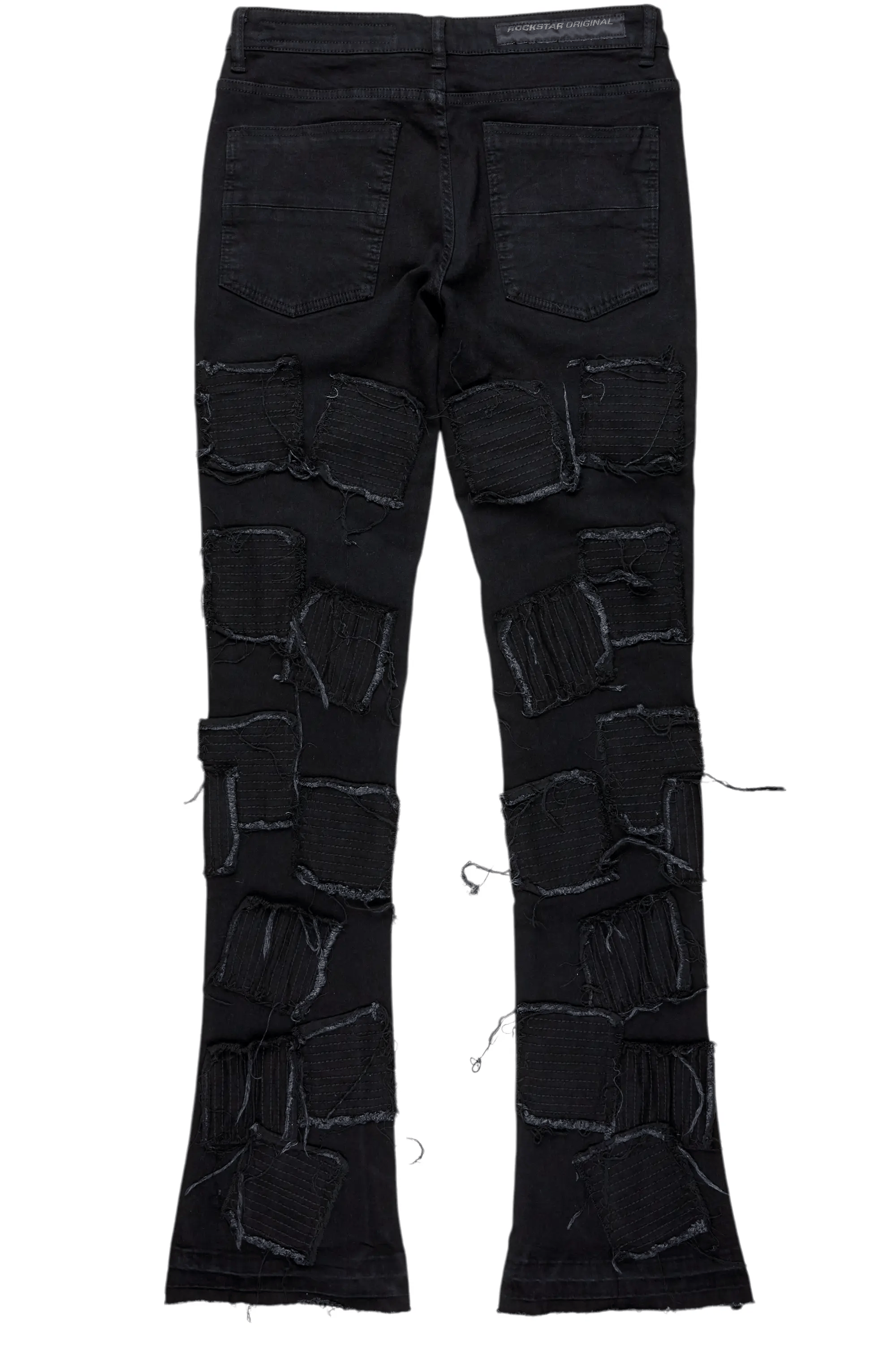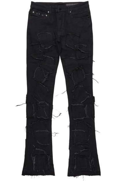 An urban stacked flare denim jean for men in jet black. Designed with organic cotton and custom detailing for the perfect streetwear style.