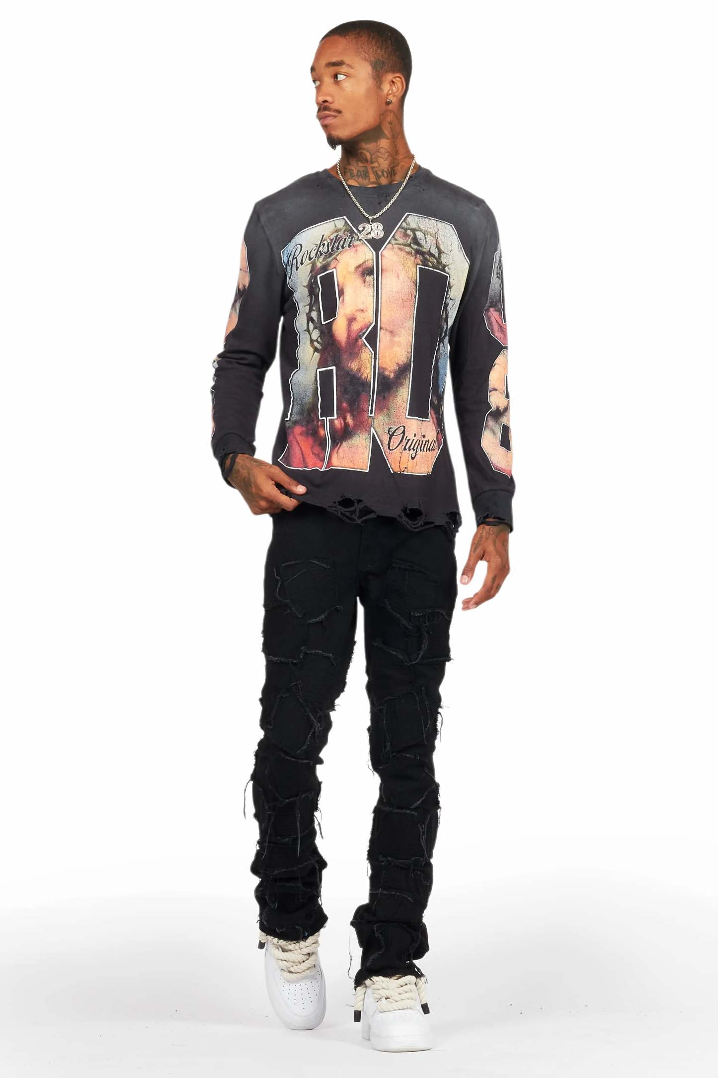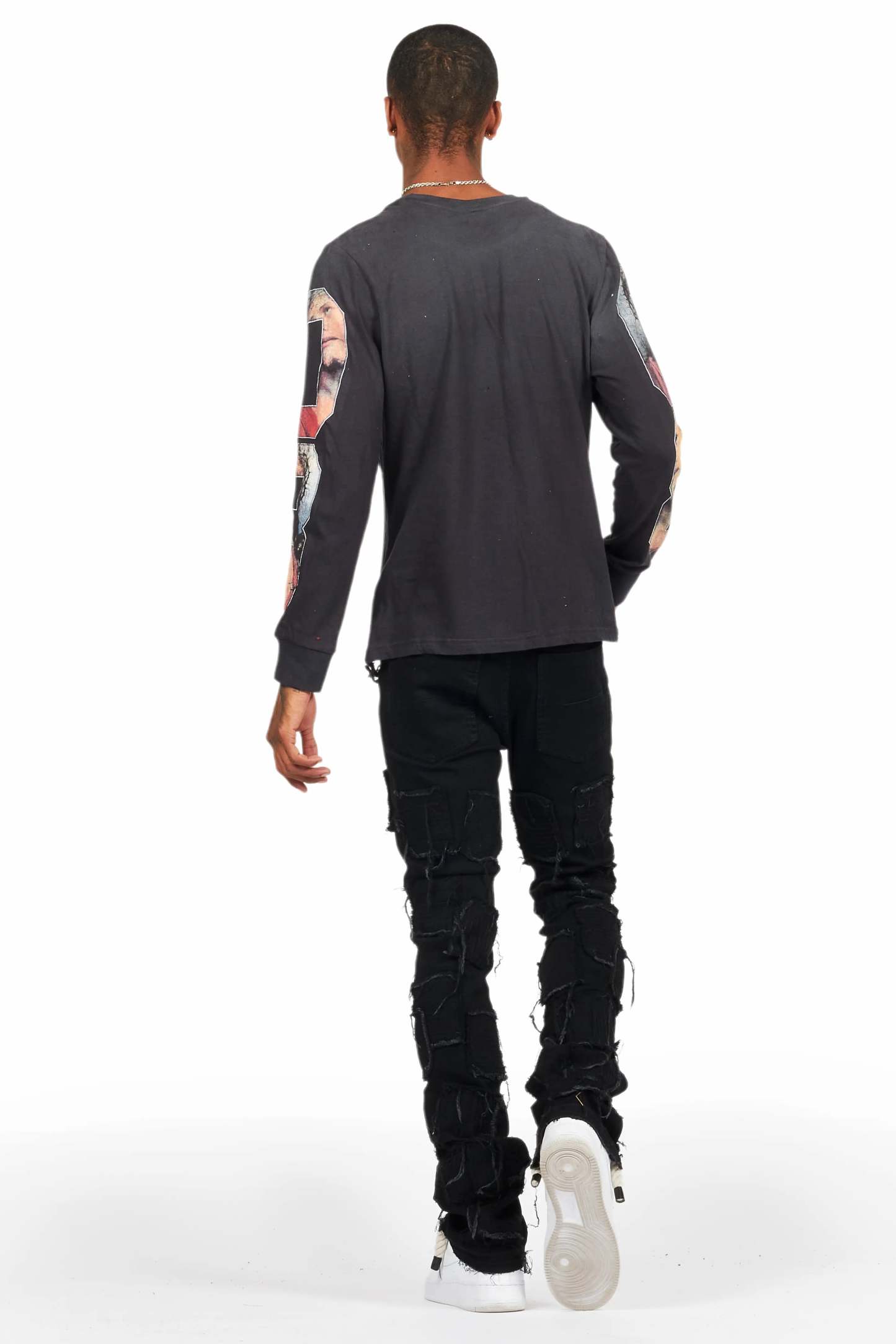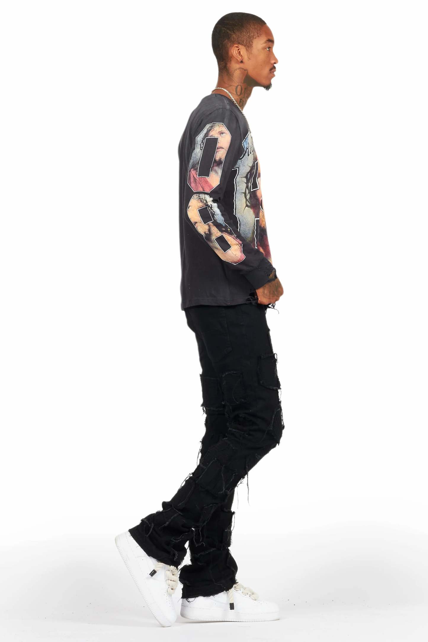 An urban stacked flare denim jean for men in jet black. Designed with organic cotton and custom detailing for the perfect streetwear style.