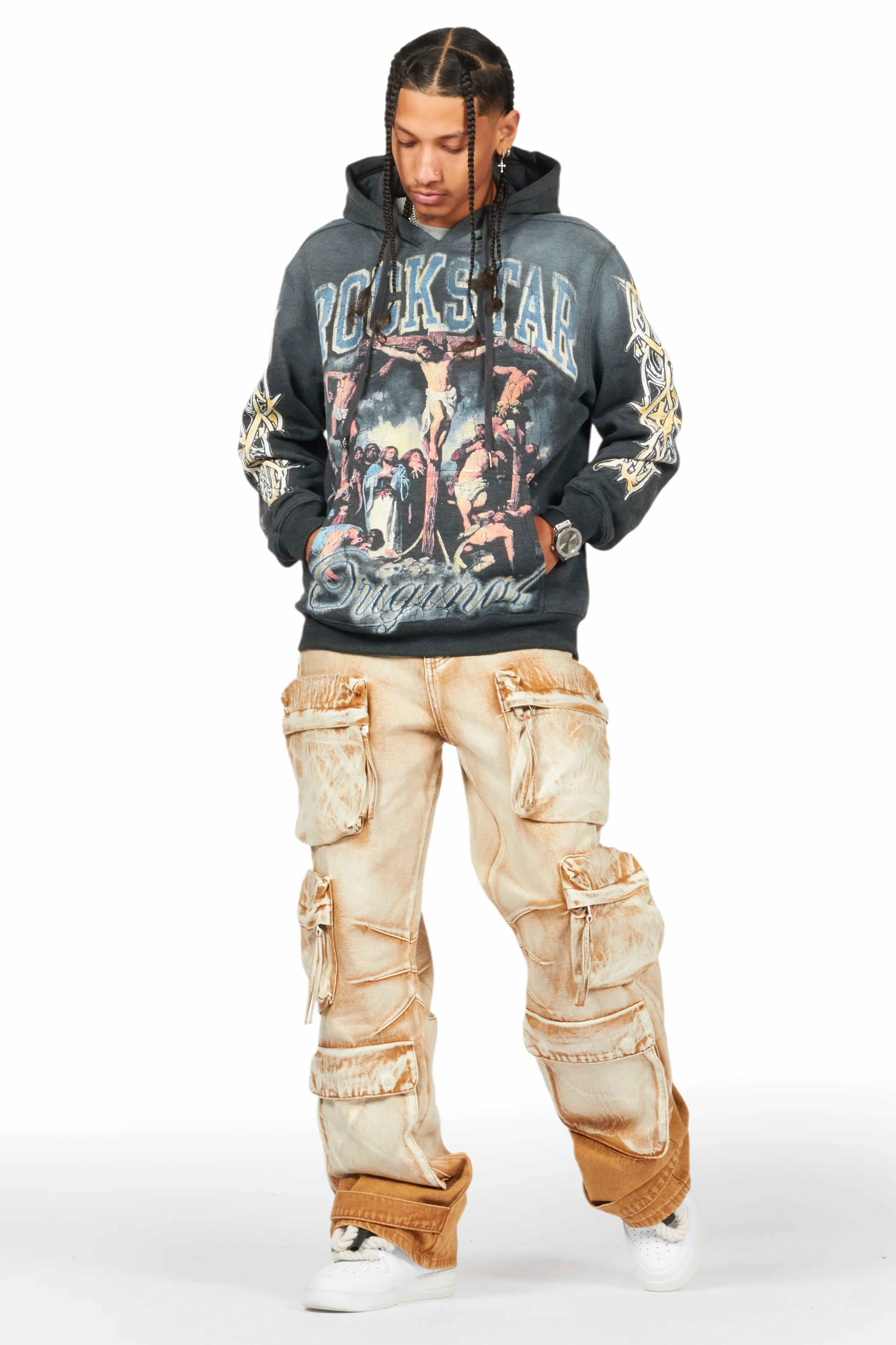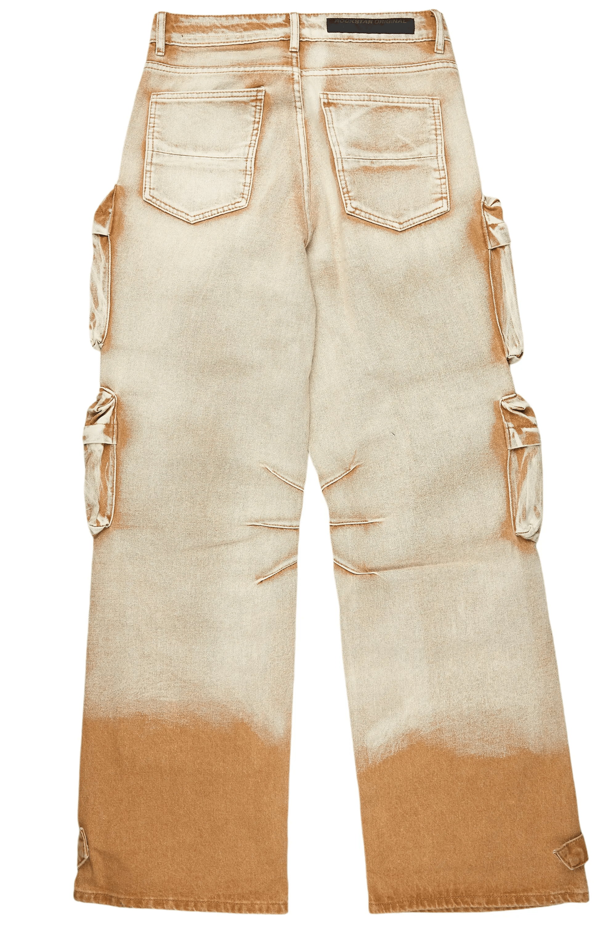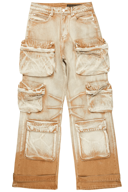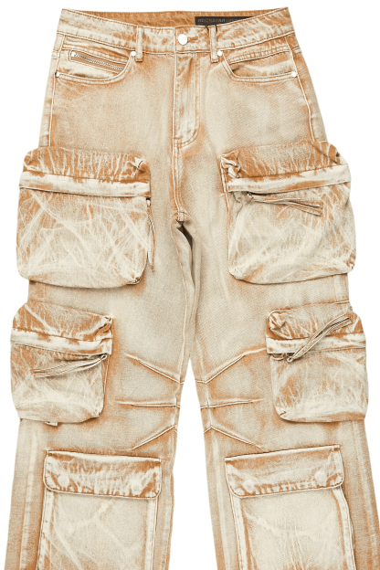 An urban cargo baggy jean for men in beige. Designed with organic cotton and utility pockets for a dope denim streetwear style.