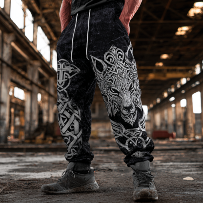 Men's Black And White Gradient Wolf Head Design Sweatpants