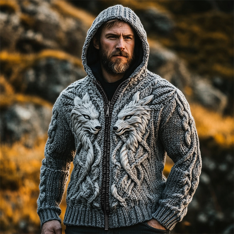 Men's Viking 3d Wolf Celtic Contrast Chunky Hooded Cardigan