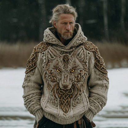 Men's Vintage Viking Wolf Celtic Knot Art Cozy Knit Hooded Sweater