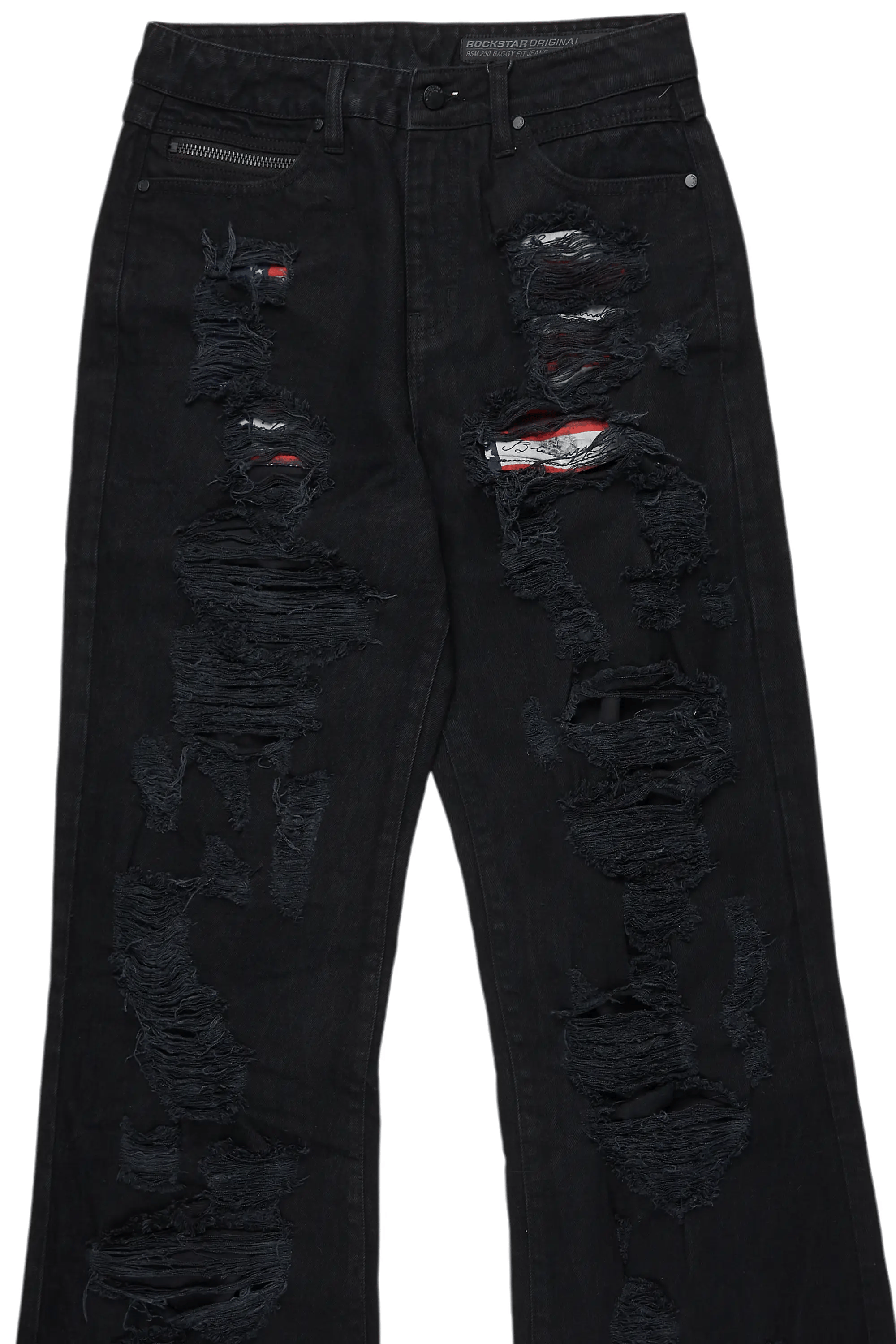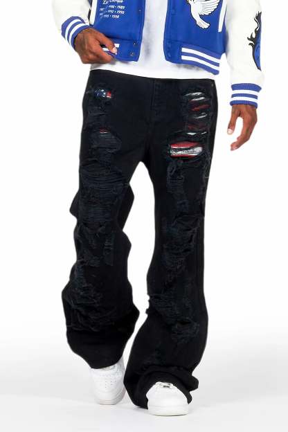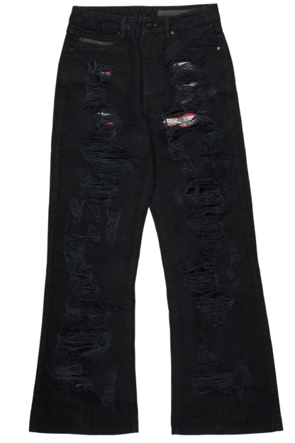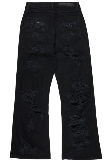 An urban baggy jean for men in black. Designed with organic cotton and distressed detailing for a dope denim streetwear style.