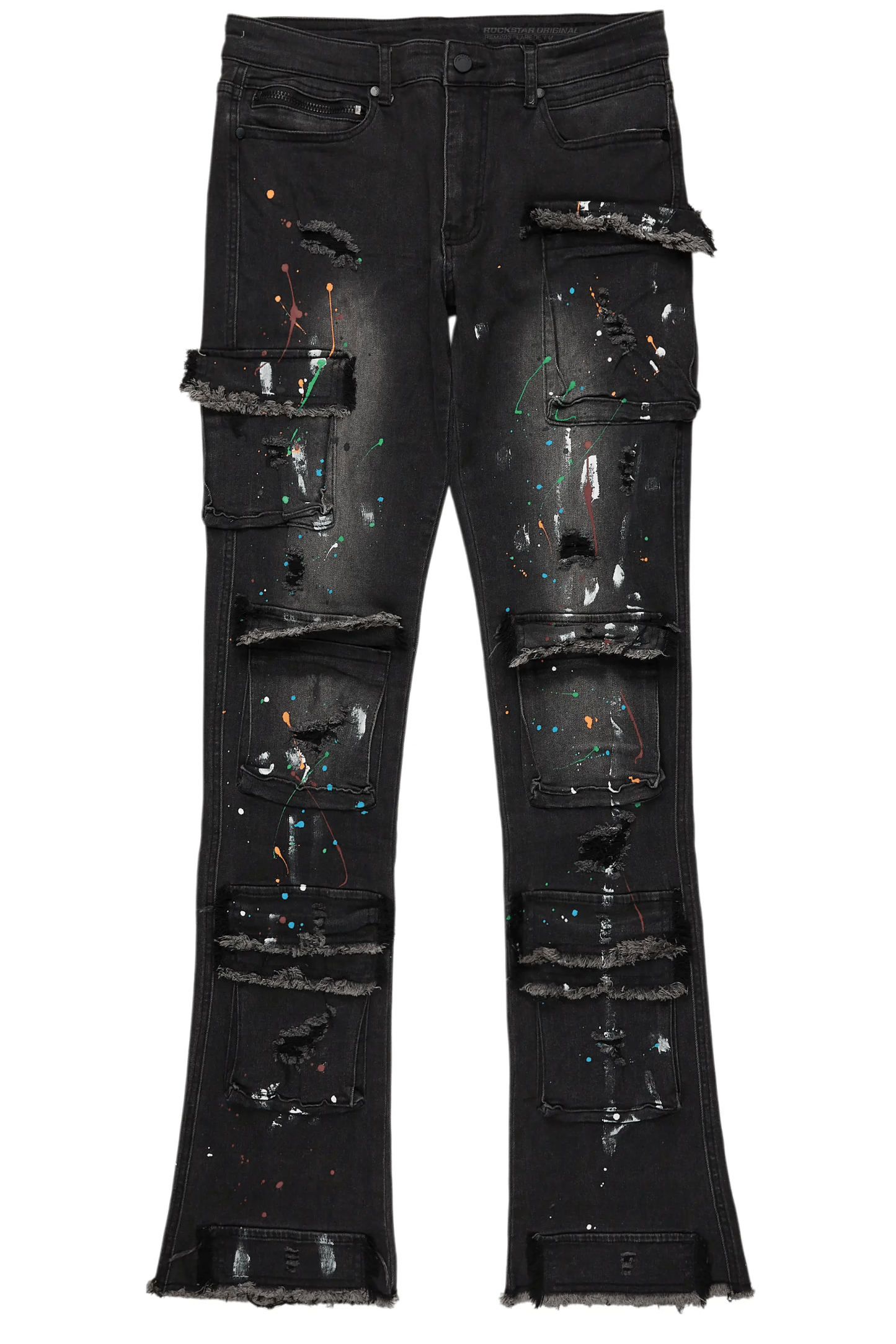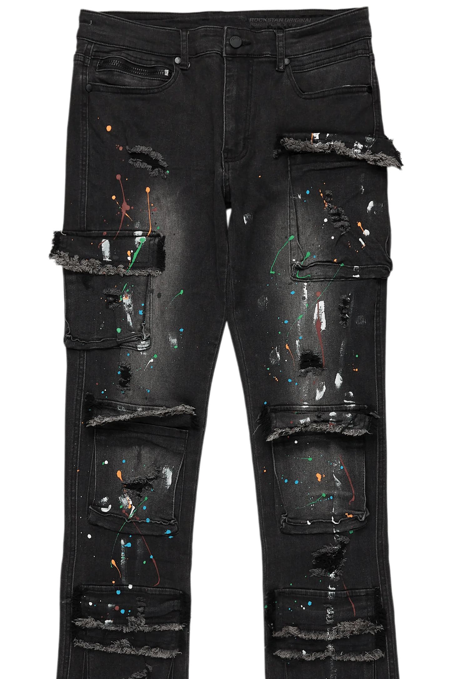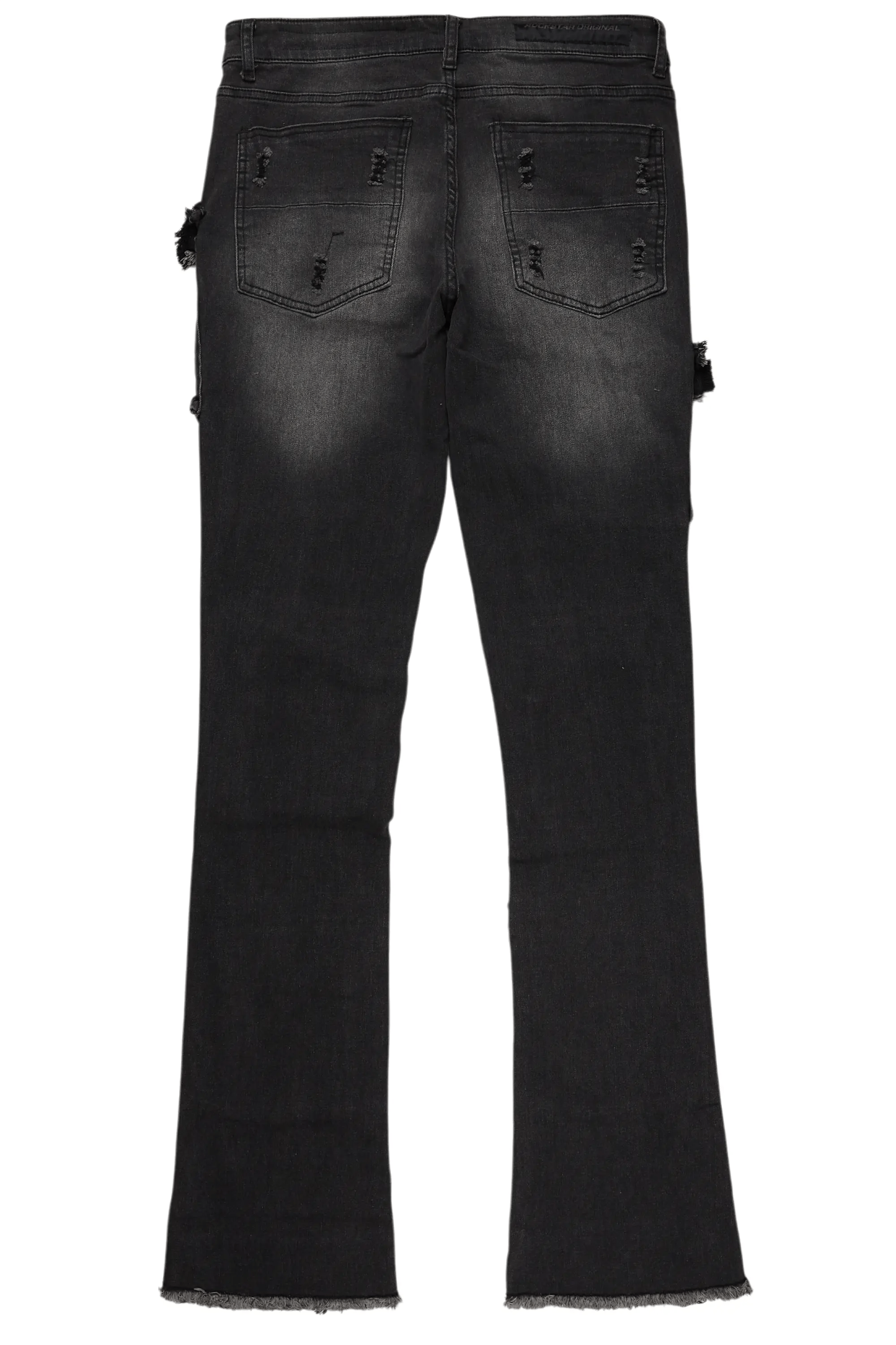 An urban stack denim cargo jean for men in black. Designed with organic cotton and extra long legs for an essential streetwear style.