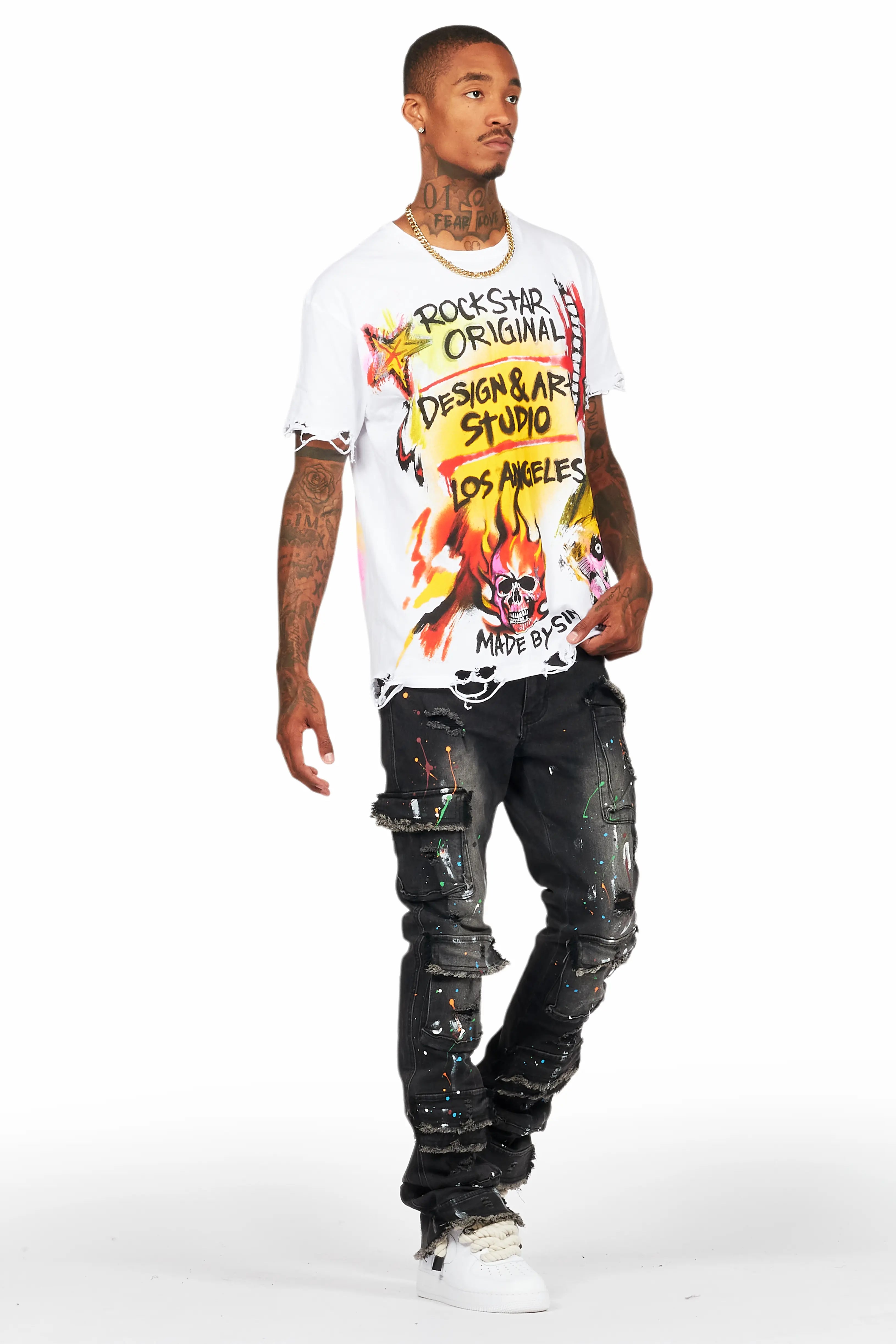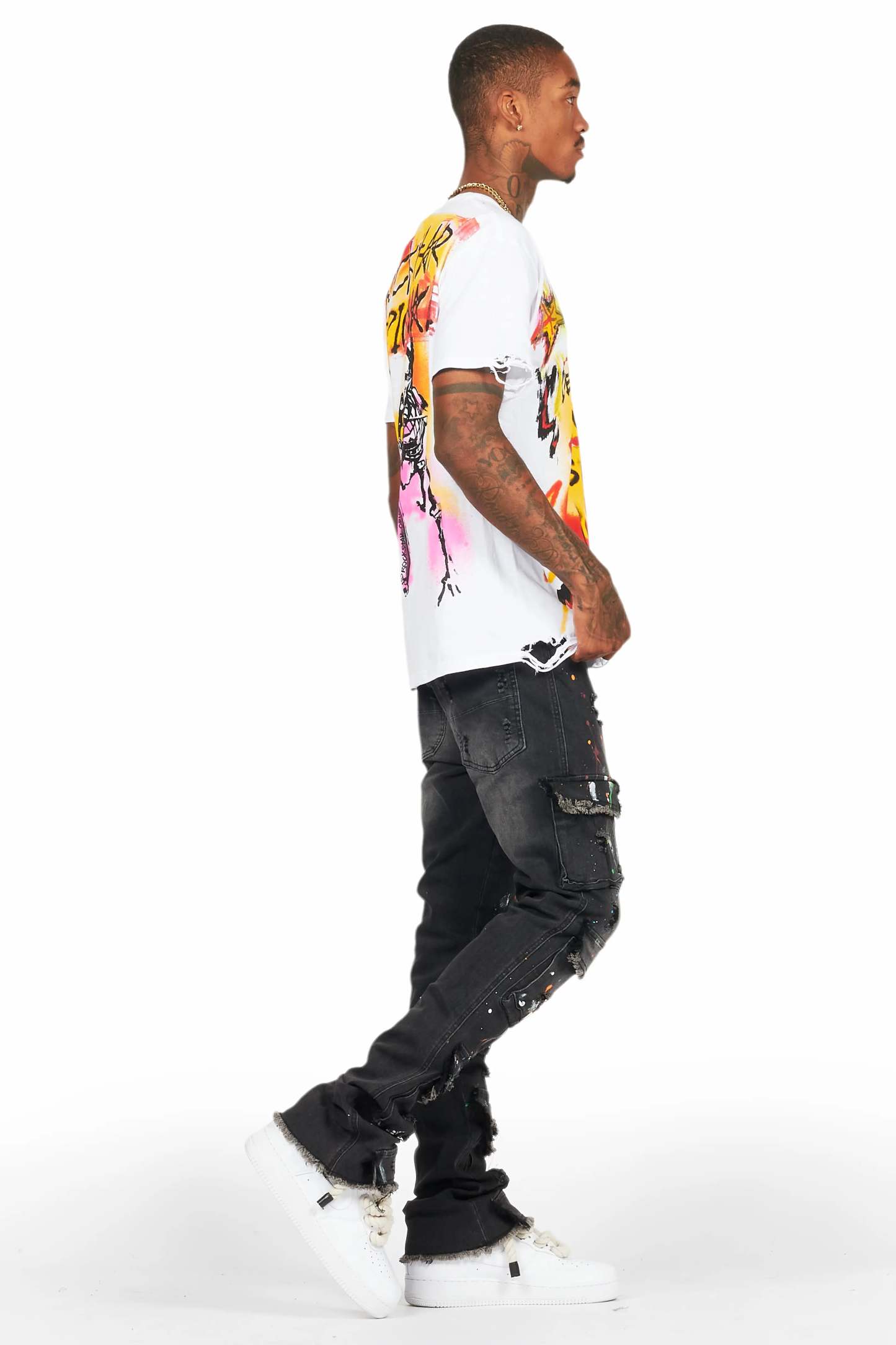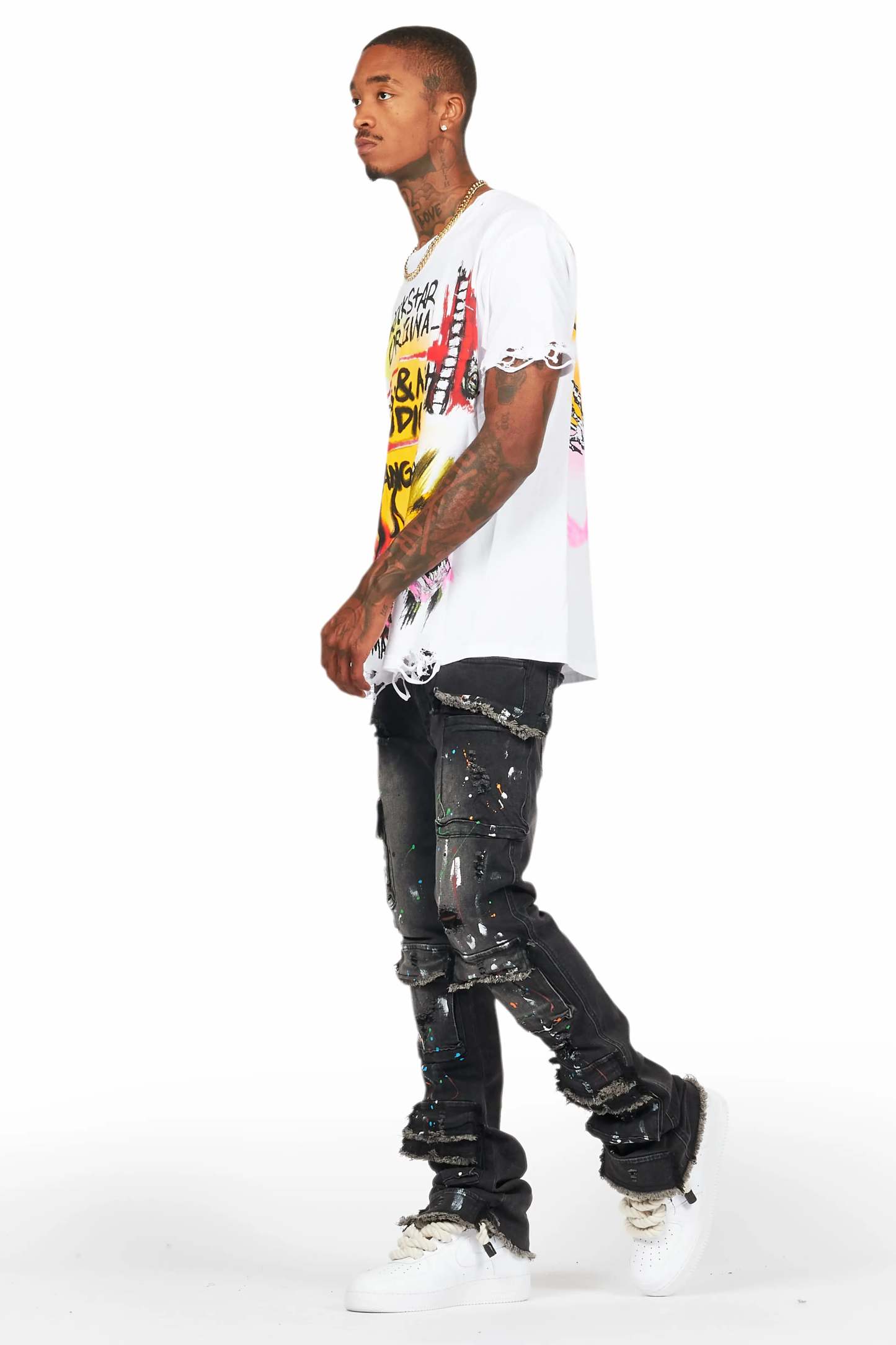 An urban stack denim cargo jean for men in black. Designed with organic cotton and extra long legs for an essential streetwear style.