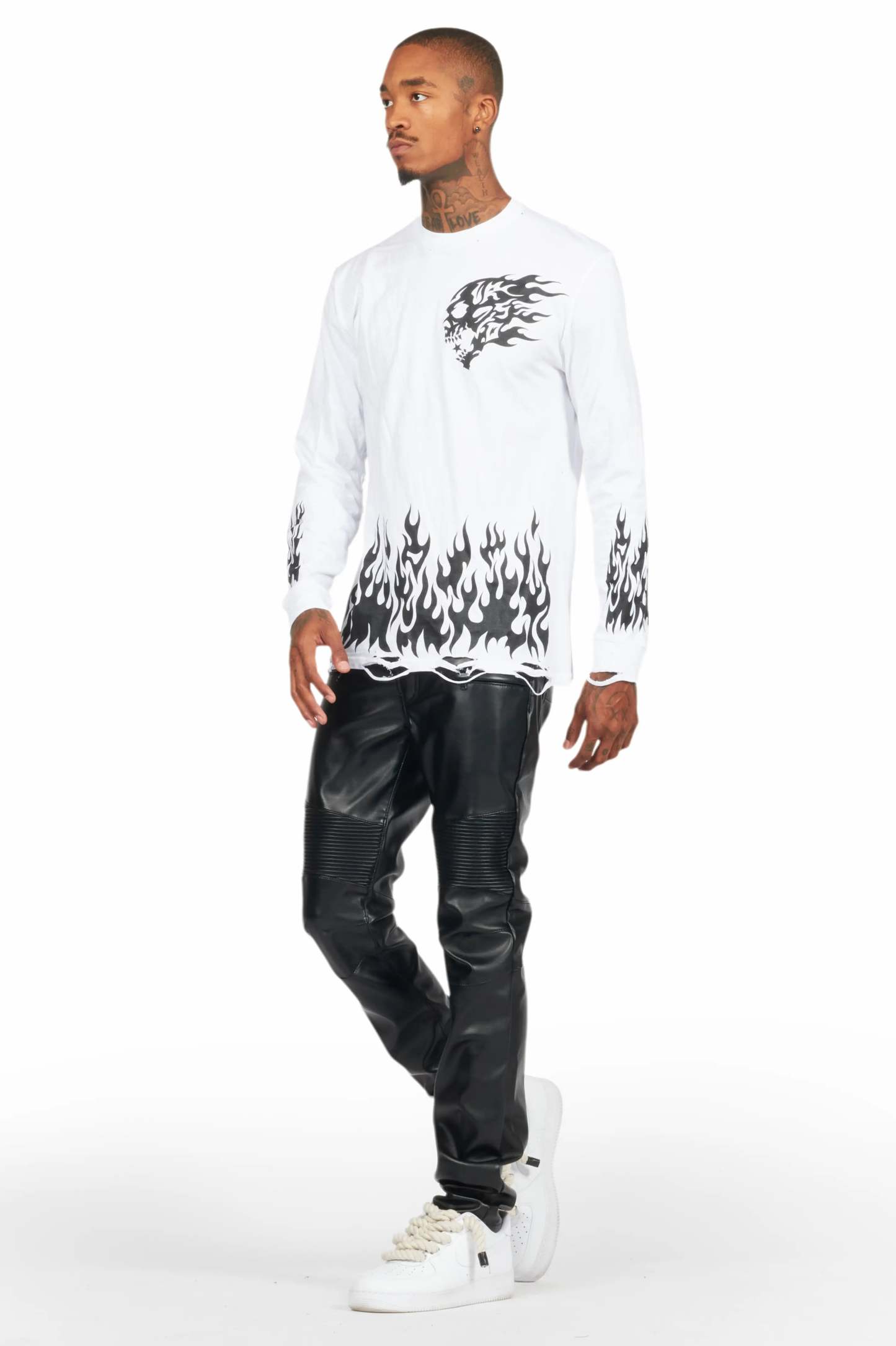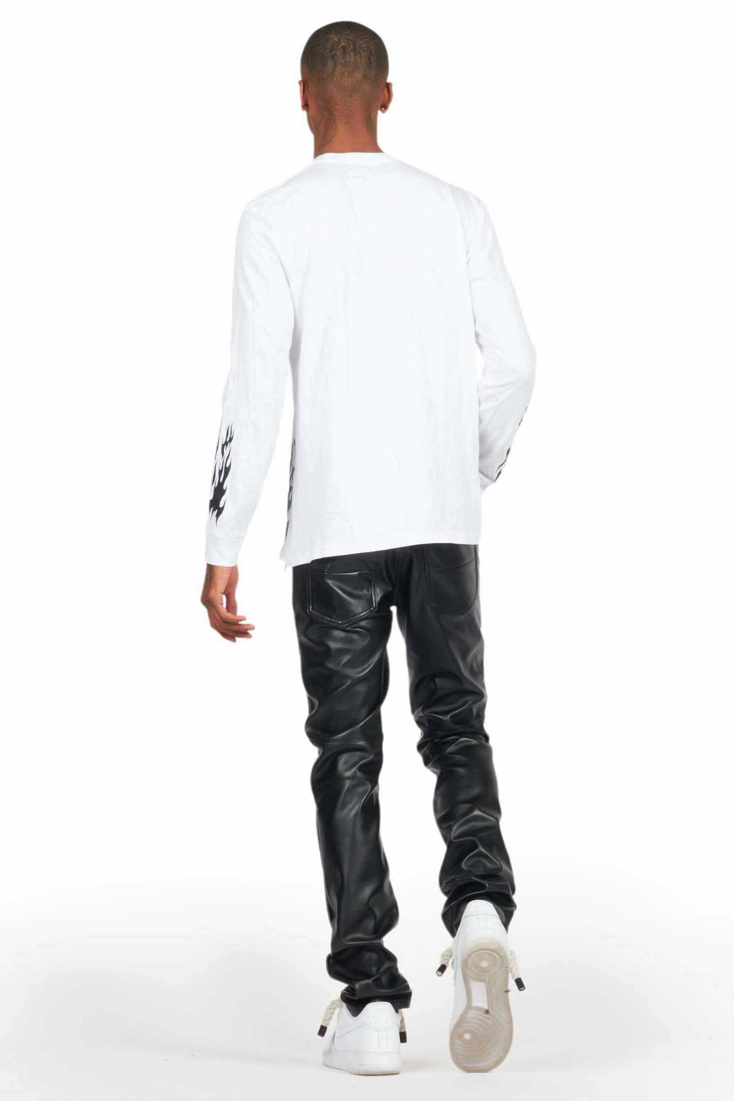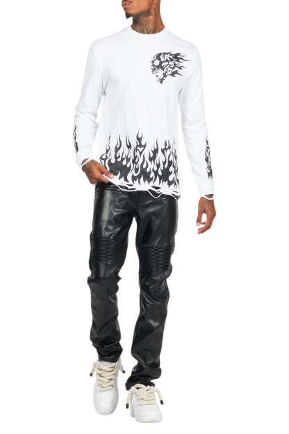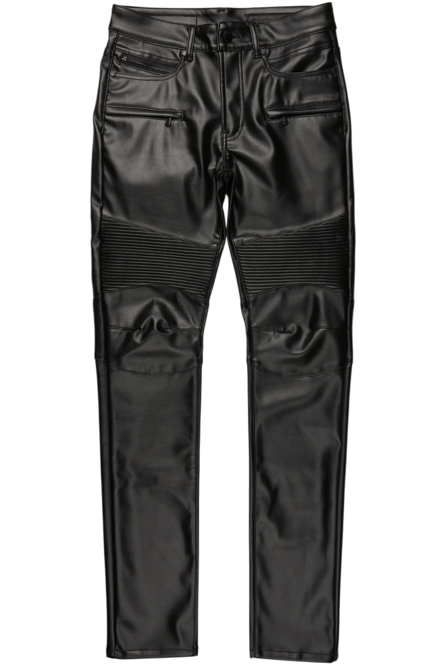 An urban skinny biker jean for men black. Designed with faux leather fabric and custom detailing for a dope denim streetwear style.