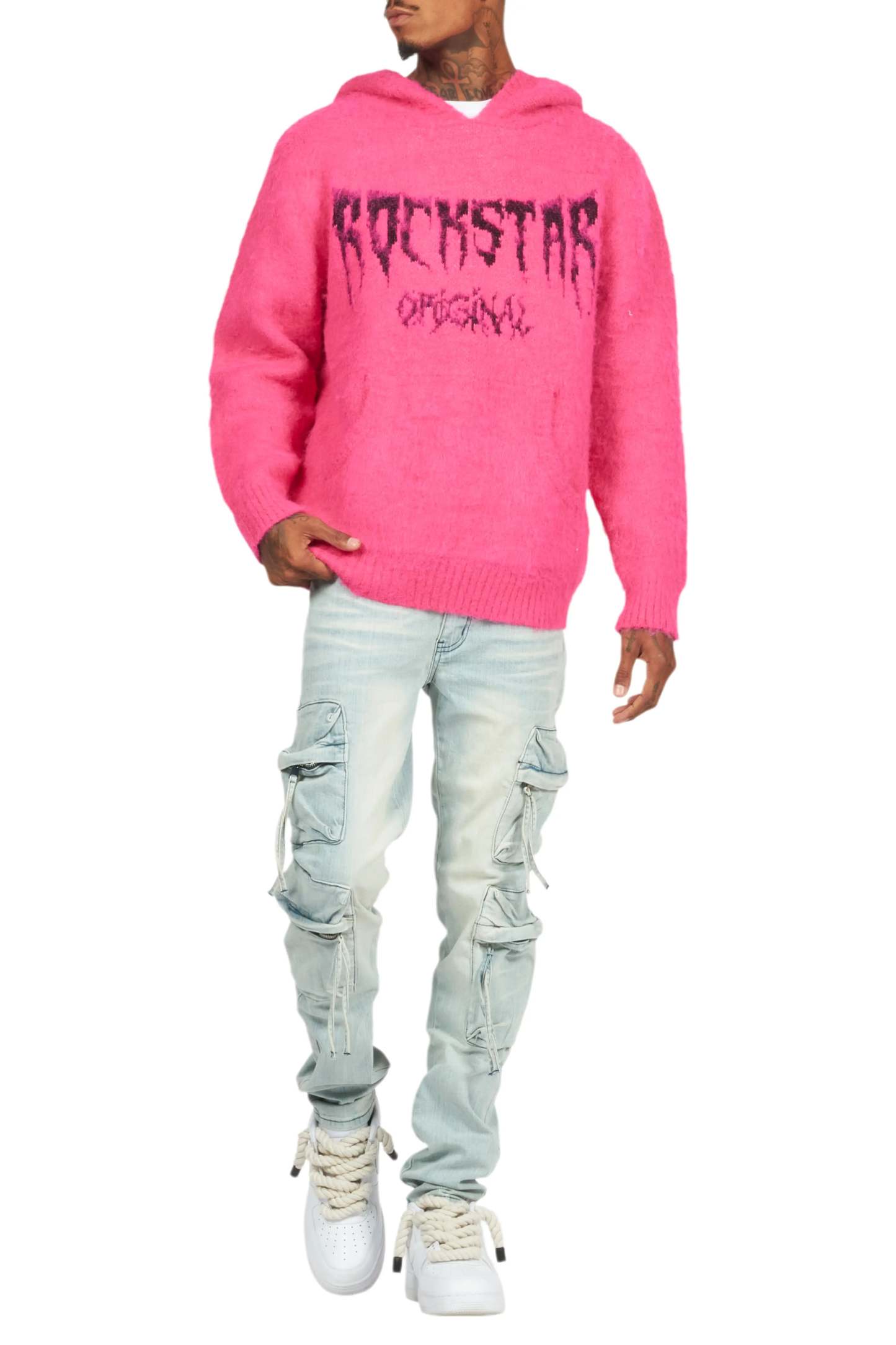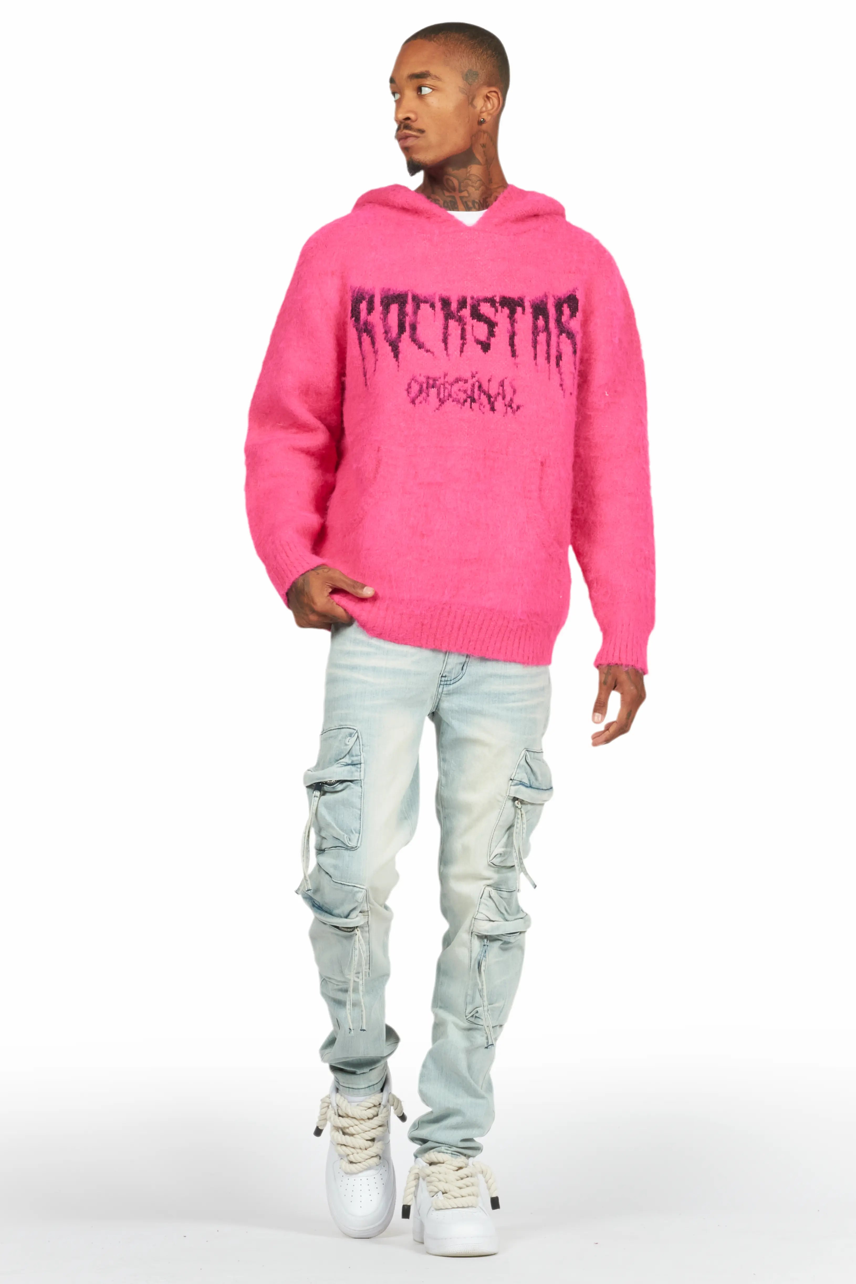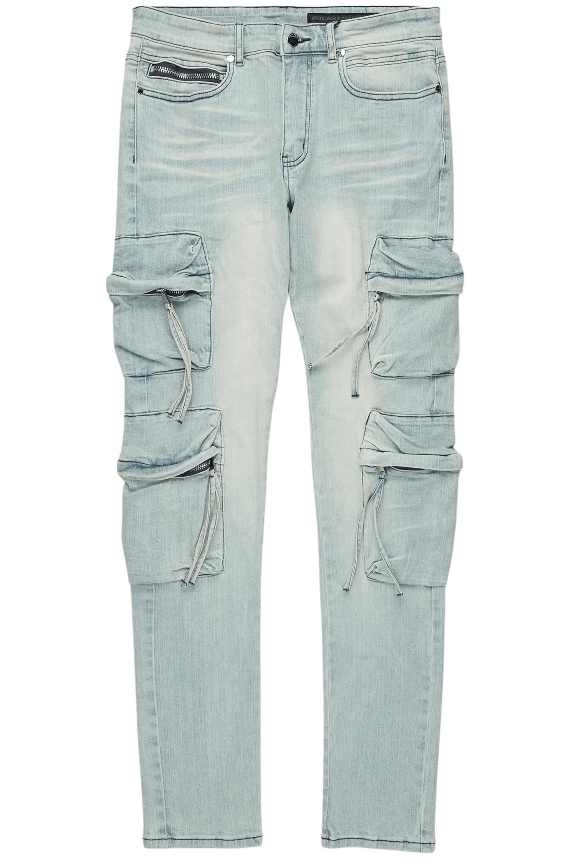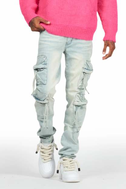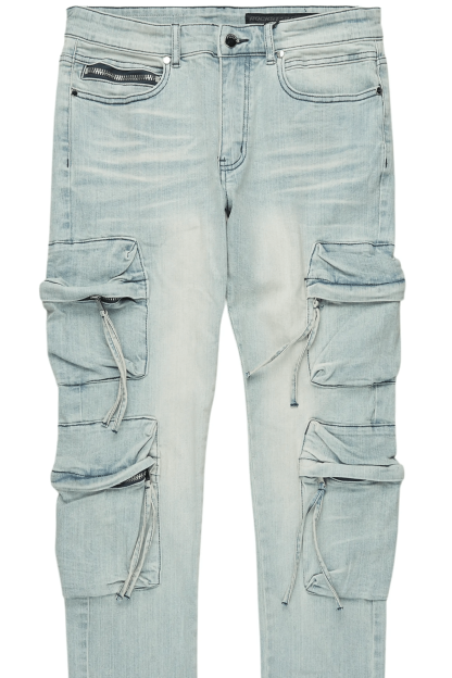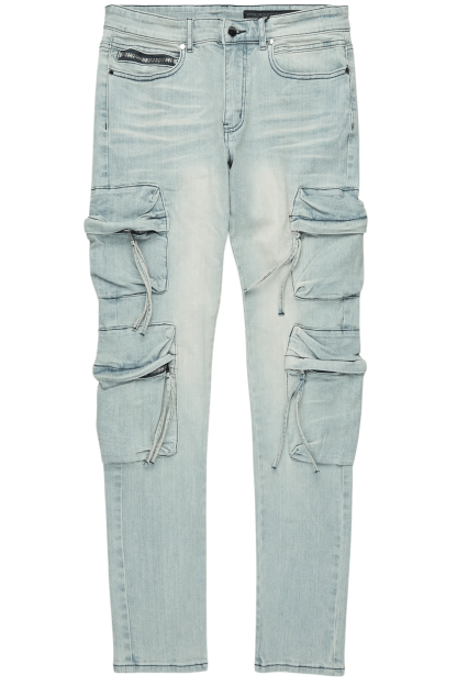 An urban denim cargo jean for men in blue. Designed with organic cotton and utility pockets for the perfect versatile style.