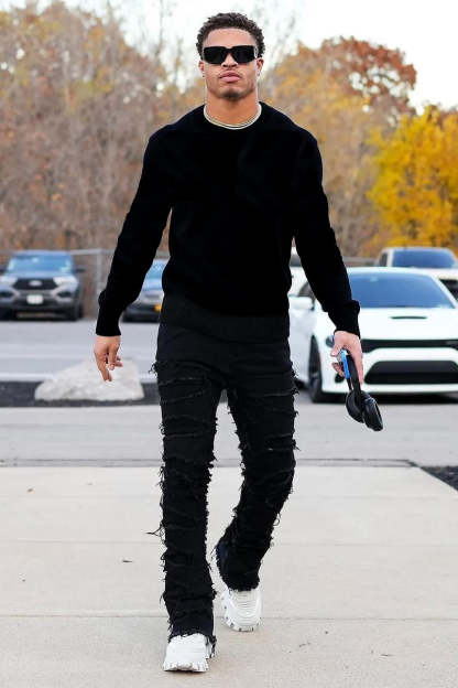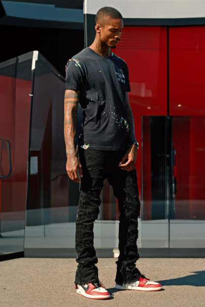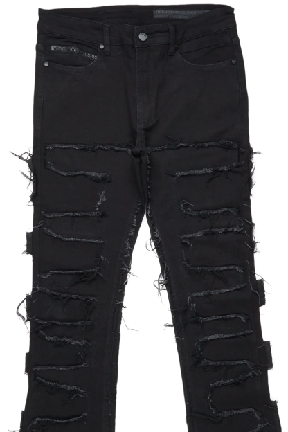 An organic cotton denim jean for men in black. Designed with patterned stitching and a flared fit for a must-cop staple piece.