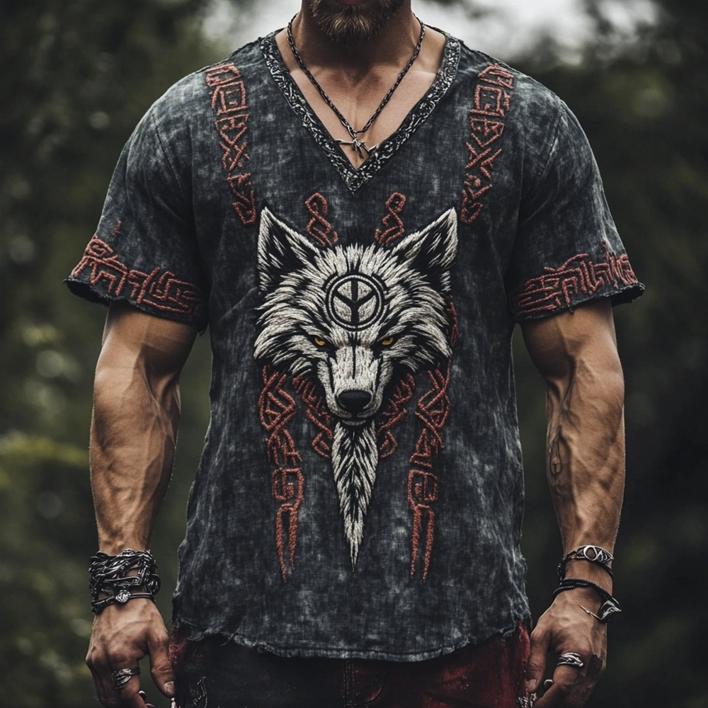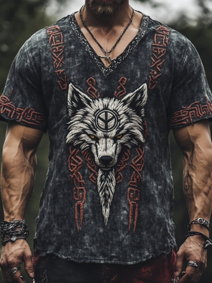 Viking Wolf Head Totem Embroidered Men's Linen V-neck T-shirt