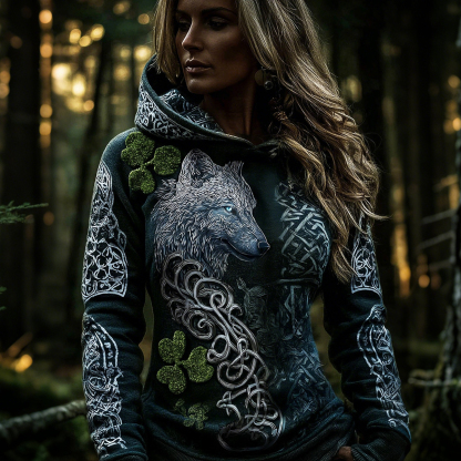 Women's Retro Celtic Wolf Totem Lucky Shamrock Print Hoodie