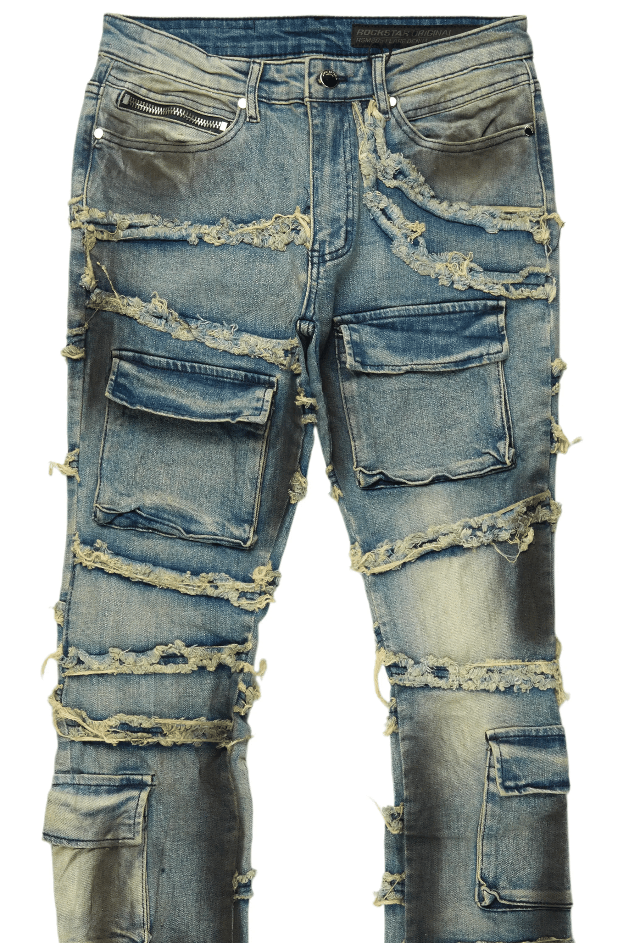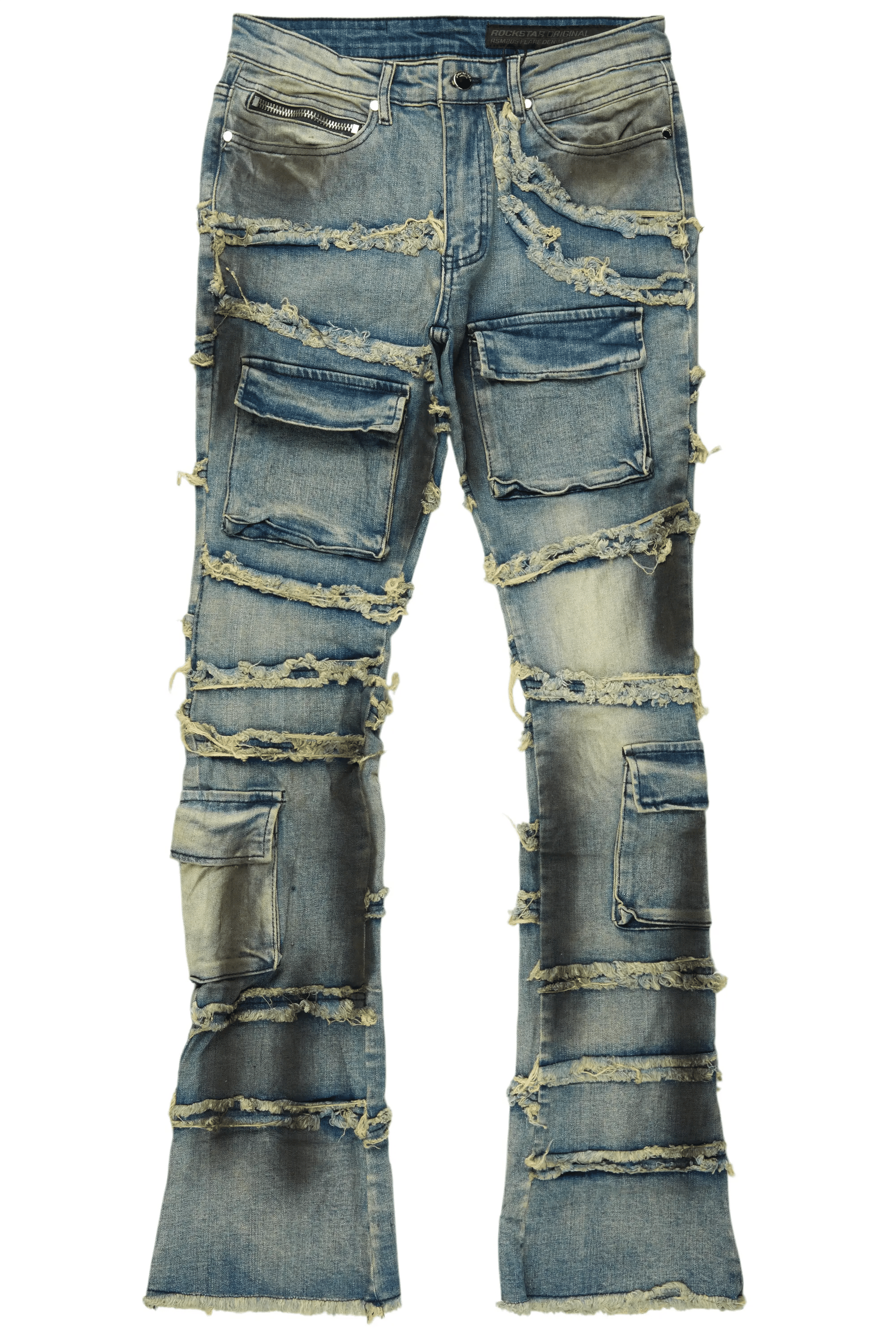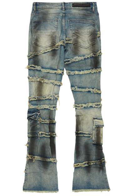 An urban stacked denim jean for men in blue. Designed with frayed patterned stitching and extra long legs for a must-cop streetwear staple piece.